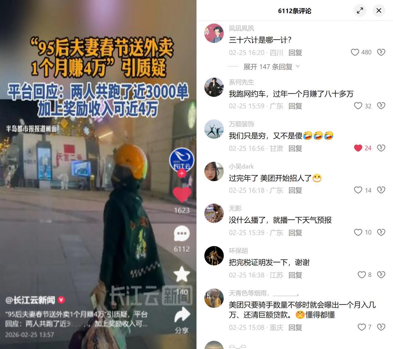 95后夫妻送外卖,月入4万? 前阵子这事儿刷屏,说俩人为还20万债,春节留守青岛跑外卖,平台称俩人共跑近3000单,算上奖励能拿4万,瞬间引来一堆质疑。 但你扒开细节就懂,哪是什么普通人能复制的励志故事? 这3000单的前提太特殊了! 青岛是春节旅游城市,订单直接爆仓; 留守骑手少,完全是僧少粥多; 还有平台叠了N项奖励,能给的好处全堆上了。 再说人均日均50单,那可不是闹着玩的! 每天要骑14小时,在零下寒风里冻得打颤,还要盯着时间怕超时、怕差评,连喝口热乎水的空都没有! 这根本就是个例,是平台挑出来的幸存者! 为啥偏偏年后放出来?还不是缺人招工吗? 把极端条件下的极限努力,包装成只要拼命就能翻身的希望,这不就是制造高收入幻觉骗老实人? 真当我们穷傻了?身边的外卖小哥,有几个能拿到这工资? 别被这种励志叙事忽悠了,底层的辛苦从来不是熬几天就能翻盘的。 这套路,看破的顶起!
