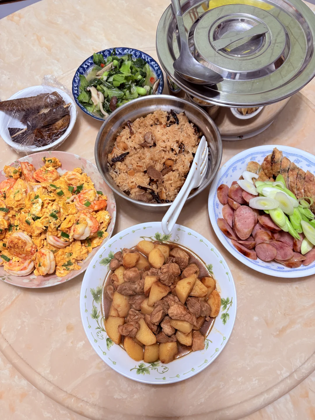 今天的早餐做了蒸包,油饼,蛋炒饭,糯玉米,香肠,鸡蛋,小咸菜,熬的八宝粥,还有牛