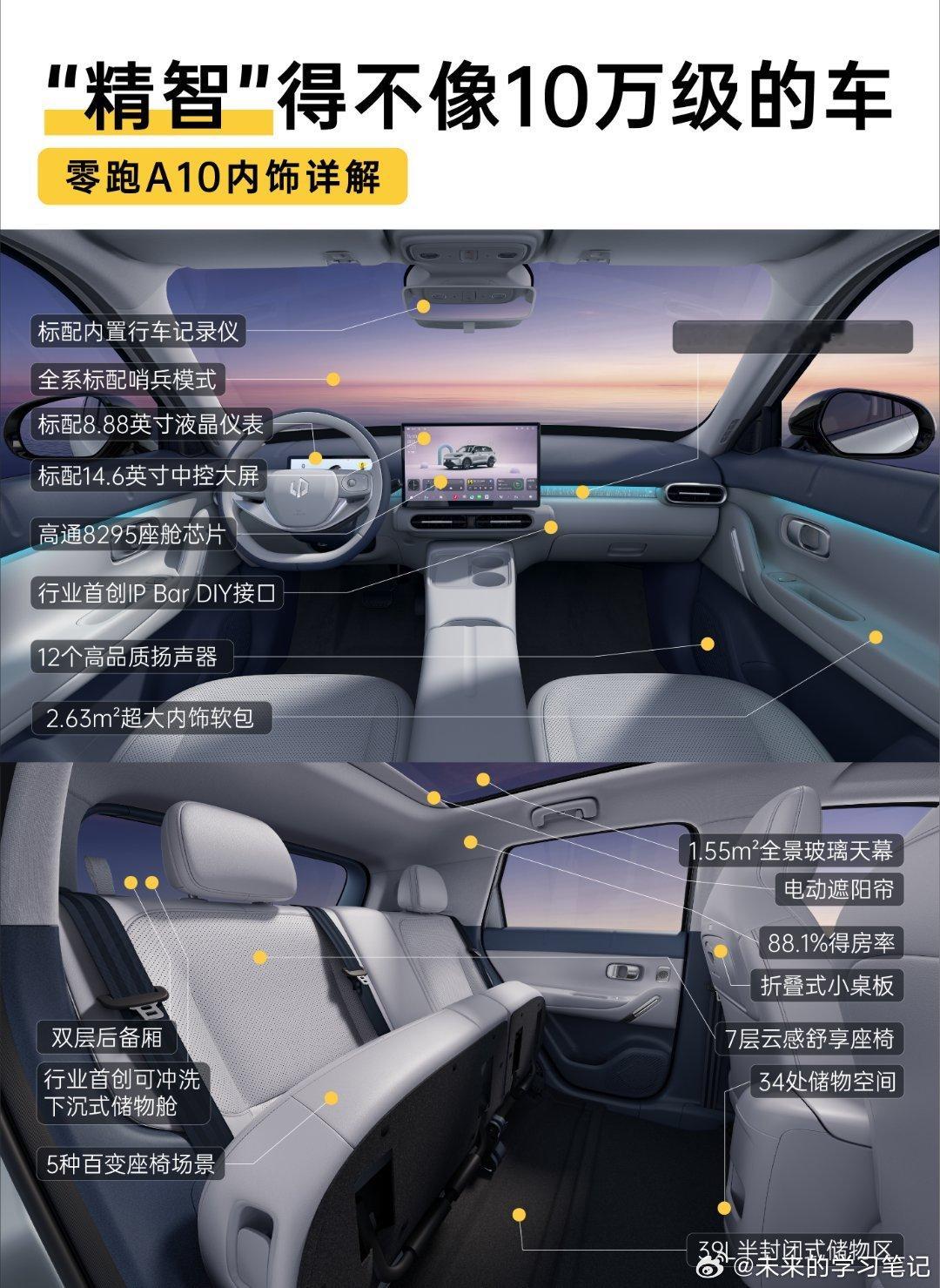 之前说过后备厢双层“干湿分离”的小巧思,能看得出来,零跑A10在用户使用场景下的功夫。其他的像电动遮阳帘、256色氛围灯、折叠小桌板这些配置也是应有尽有,咱说15-20万的车有没有配齐这些还两说,A10这次的诚意算是给足了,只要价格合适,26号开启预售大概率又是一款爆款车型,大家可以期待一下