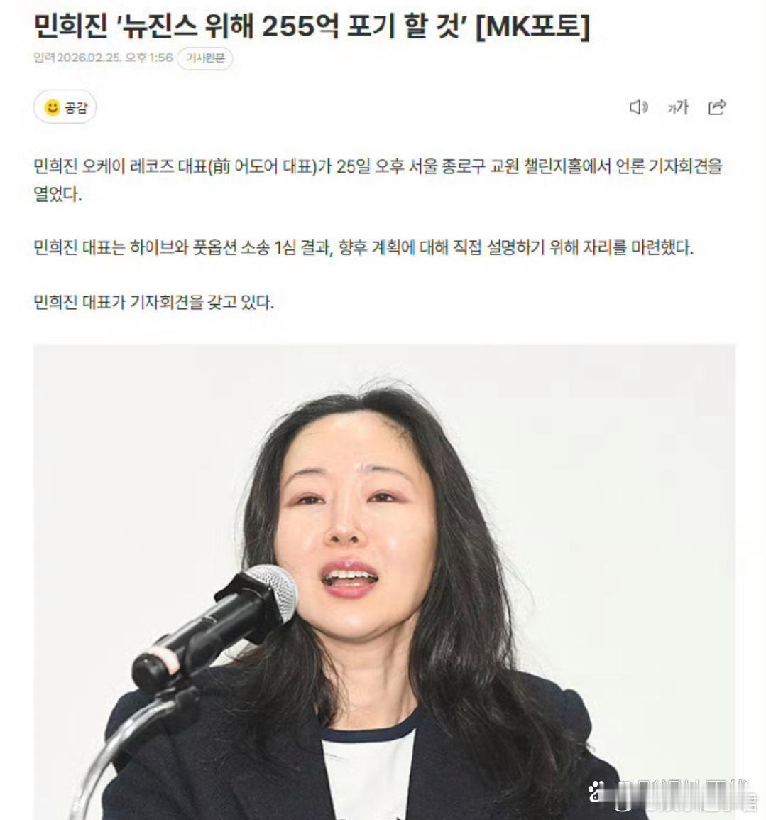 25日,闵熙珍在记者会上提出放弃她获得的255亿(约1.22亿人民币)韩元法院和解金,希望HYBE可以解除NewJeans的合约,并撤销对NewJeans粉丝及所有相关人员的法律诉讼。