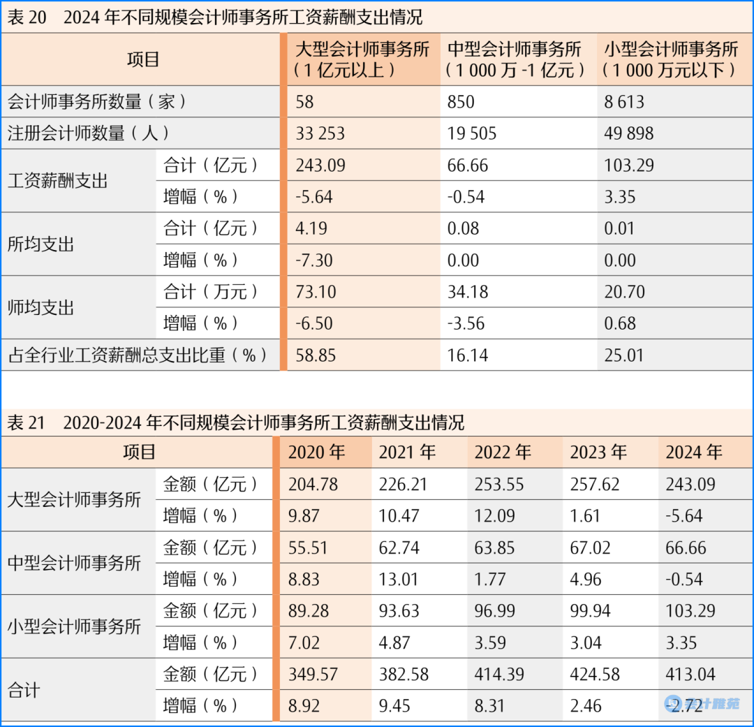 2024年,注册会计师行业工资薪酬支出合计413.04亿元,较上年下降11.54亿元,占行业成本费用总支出的42.8%,较上年相比上升1.14个百分点。由于行业所处现代服务业的特点,人工成本中的工资薪酬支出成为行业最大支出。其中,大型会计师事务所和中型会计师事务所的工资薪酬支出分别为243.09亿元和66.66亿元,降速分别为5.64%和0.54%,小型会计师事务所的工资薪酬支出为103.29亿元,增速为3.35%。大型会计师事务所师均支出73.1万元,中型会计师事务所师均支出34.18万元,相对上年均有小幅下跌,小型会计师事务所师均支出20.70万元,相对上年略有增加。