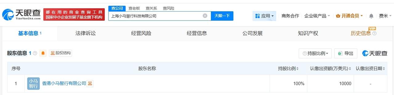 小马智行在上海成立小马慧行科技公司 注册资本1亿美元 天眼查App显示,2月24日,上海小马慧行科技有限公司成立,法定代表人为黄俊,注册资本1亿美元,经营范围包括软件开发、汽车销售、小微型客车租赁经营服务等,由香港小马智行有限公司全资持股。 天眼查信息: