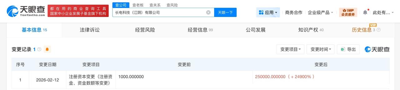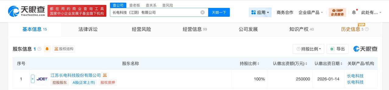 长电科技江阴公司增资至25亿 增幅24900% 天眼查App显示,近日,长电科技(江阴)有限公司发生工商变更,注册资本由1000万人民币增至25亿人民币,增幅24900%。 该公司成立于2025年5月,法定代表人为李全兵,经营范围为电力电子元器件制造、电力电子元器件销售、集成电路制造、集成电路销售、集成电路芯片及产品制造、集成电路芯片及产品销售等,由长电科技(600584)全资持股。 天眼查信息: