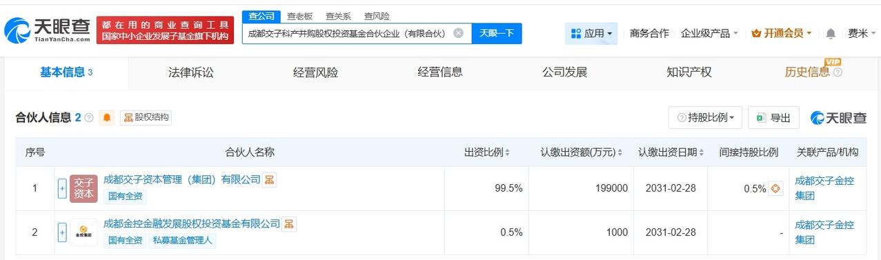 成都交子科产并购股权投资基金登记成立 出资额20亿 天眼查App显示,近日,成都交子科产并购股权投资基金合伙企业(有限合伙)成立,执行事务合伙人为成都金控金融发展股权投资基金有限公司,出资额20亿人民币,经营范围为以私募基金从事股权投资、投资管理、资产管理等活动,由成都交子资本管理(集团)有限公司、成都金控金融发展股权投资基金有限公司共同出资。 天眼查信息:
