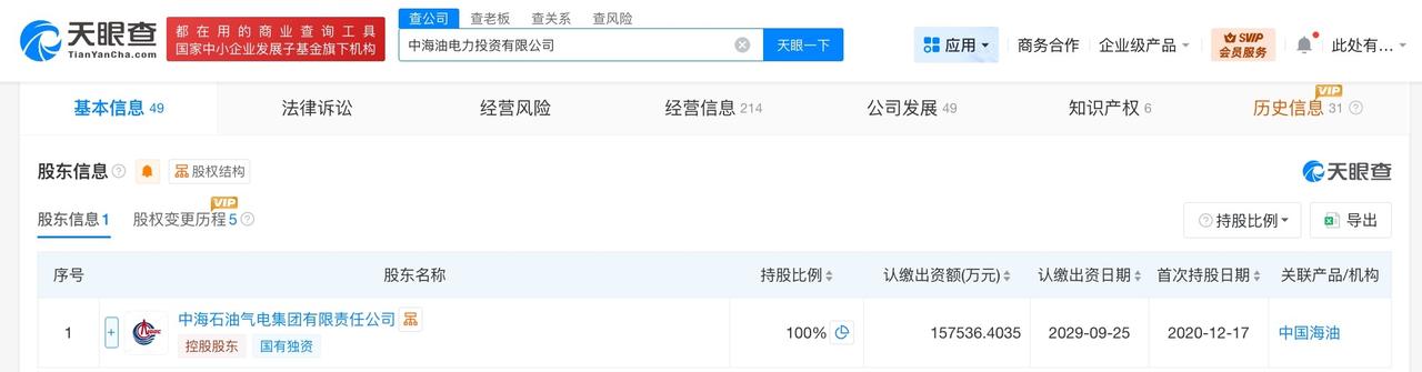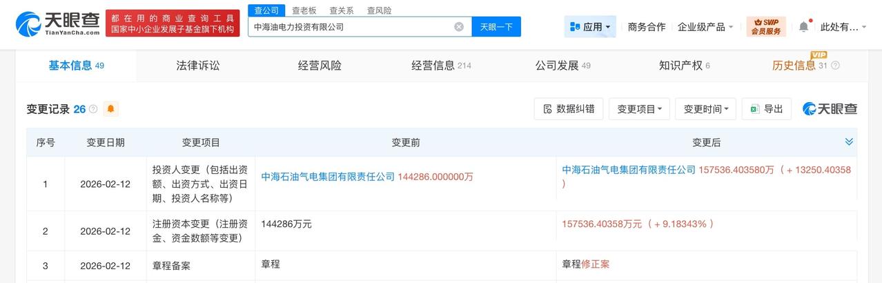 中海油电力投资公司增资至15.8亿 增幅约9% 天眼查App显示,近日,中海油电力投资有限公司发生工商变更,注册资本由约14.4亿人民币增至约15.8亿人民币,增幅约9%。 该公司成立于2020年12月,法定代表人为刘卫华,经营范围含以自有资金从事投资活动、发电技术服务、节能管理服务、电气设备修理、集中式快速充电站等。股东信息显示,该公司由中海石油气电集团有限责任公司全资持股。 天眼查信息: