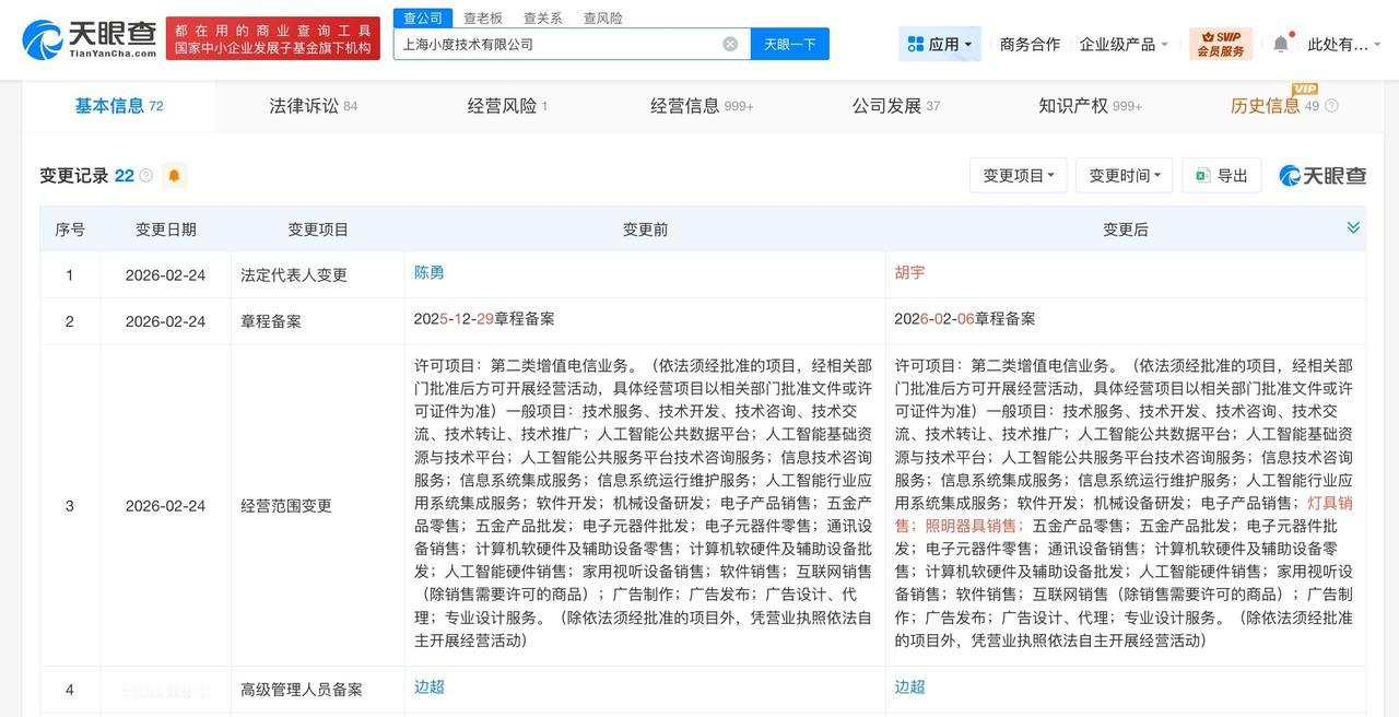 小度科技法定代表人变更 小度科技高管发生变更 天眼查App显示,近日,小度科技