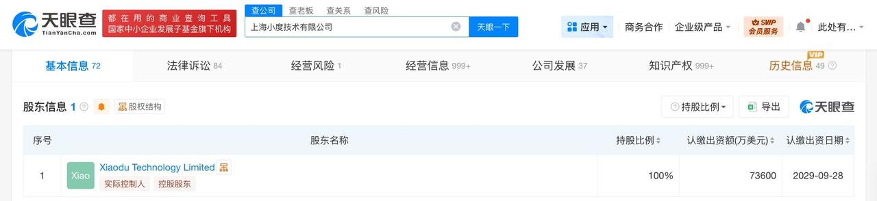 小度科技法定代表人变更 小度科技高管发生变更 天眼查App显示,近日,小度科技关联公司上海小度技术有限公司发生工商变更,陈勇卸任法定代表人、经理、董事,由胡宇接任。 上海小度技术有限公司成立于2020年10月,注册资本7.36亿美元,经营范围含人工智能公共数据平台、人工智能基础资源与技术平台、人工智能公共服务平台技术咨询服务、信息技术咨询服务、信息系统集成服务、人工智能行业应用系统集成服务、软件开发、机械设备研发等,由Xiaodu Technology Limited全资持股。 天眼查信息: