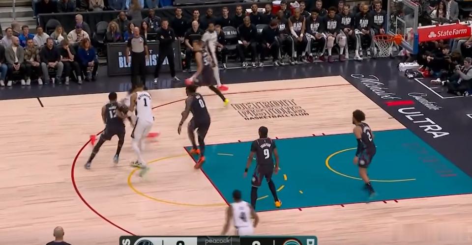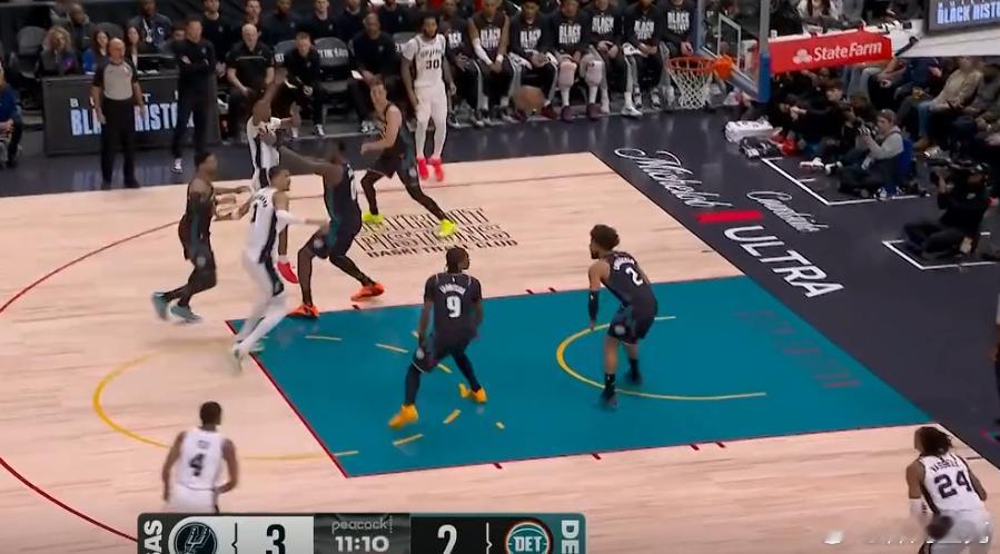 6789 10卡斯尔弧顶持球操刀与文班的挡拆配合,行进间吸引活塞弱侧大范围回收、压缩中路空间,立即长传精准制导弱侧底角的瓦塞尔,瓦塞尔接球三分手起刀落,惩罚放空。