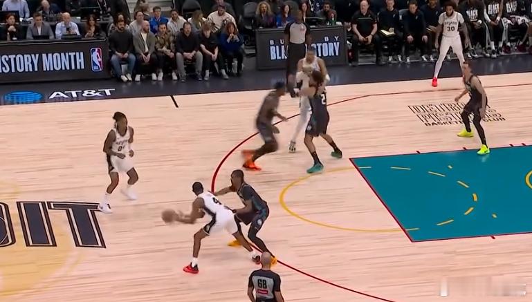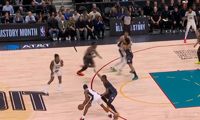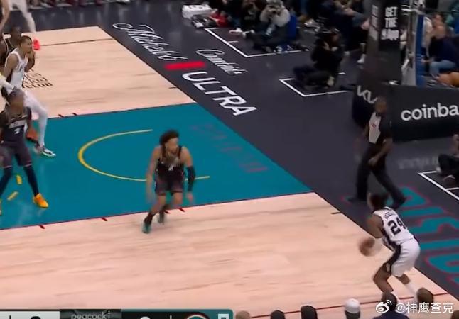 12345福克斯三分线外拿球发牌,瓦塞尔为文班设置Rip Screen后顺势落位至弧顶获得出手空档,随后接福克斯传球迎着扑防的CC拔起就射,三分稳稳命中。
