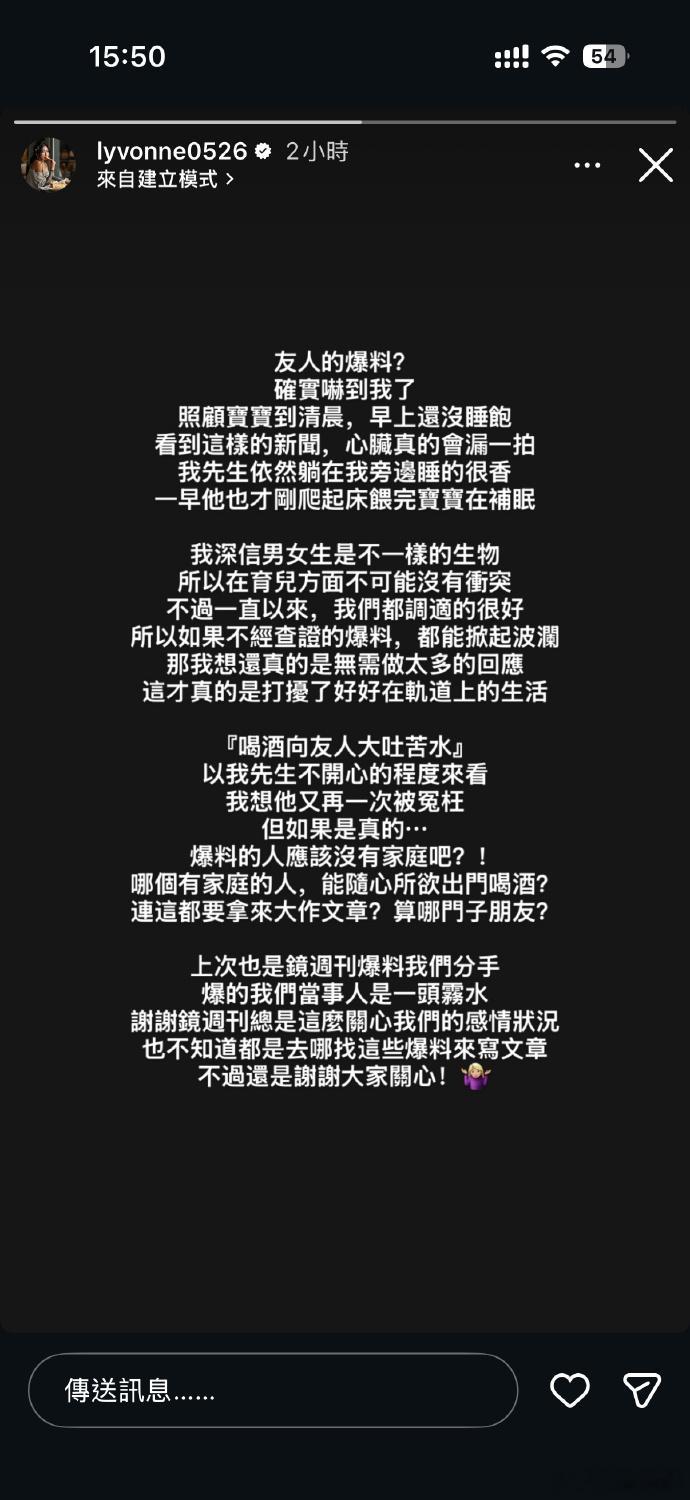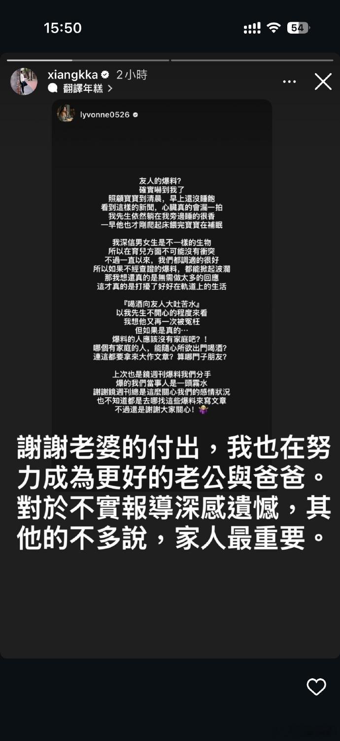 刘雨柔否认婚变传闻 近日台媒曝刘雨柔、胡凯翔婚变,对此夫妻俩双双发文回应:刘雨柔称早上看到新闻时,老公依然躺在她旁边睡得很香。而针对两人被指育儿观念不合一事,她回应称:“男女生是不一样的生物,所以在育儿方面不可能没有冲突,不过一直以来,我们都调适的很好。”胡凯翔则转发刘雨柔文章,并写道:“谢谢老婆的付出,我也在努力成为更好的老公与爸爸。对于不实报道深感遗憾,其他的不多说,家人最重要”。