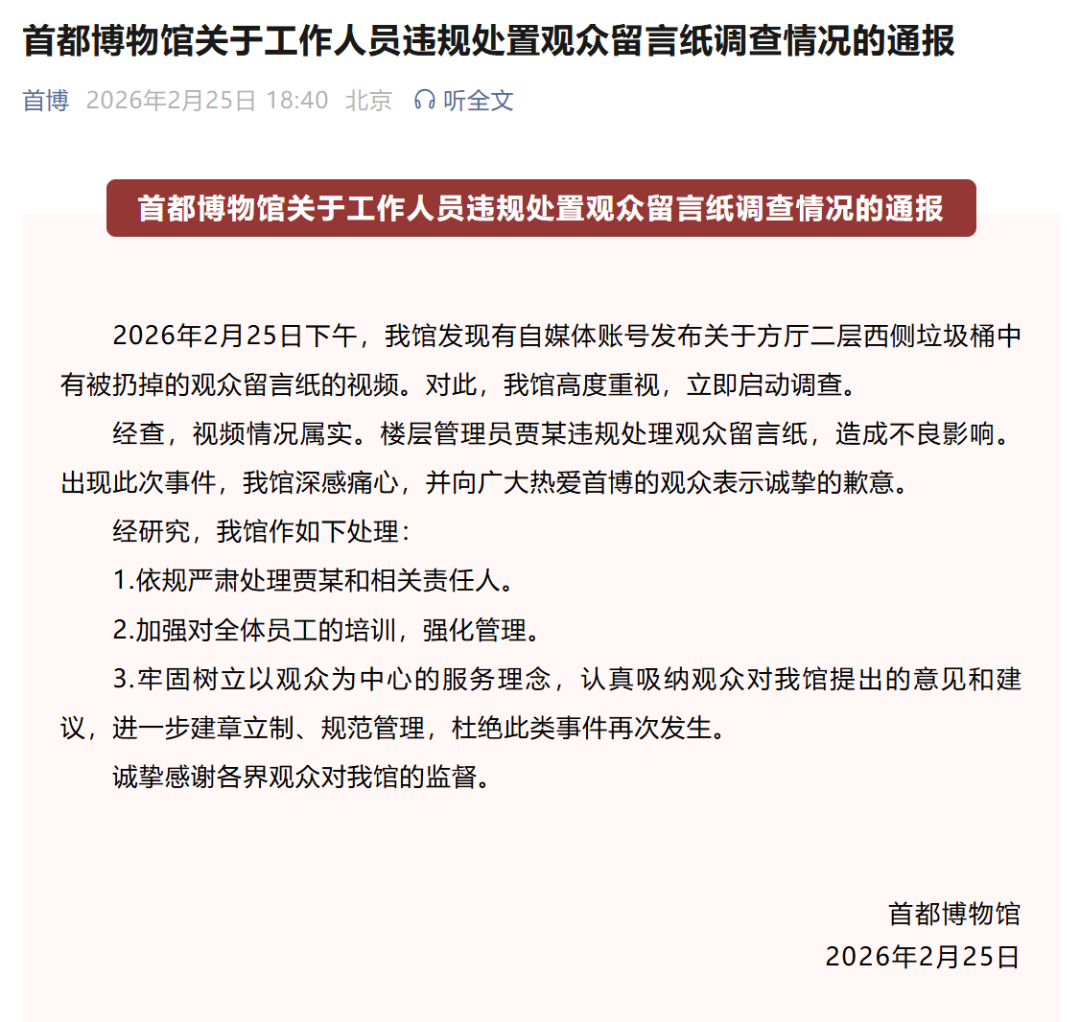 2月25日,首都博物馆发布关于工作人员违规处置观众留言纸调查情况的通报: