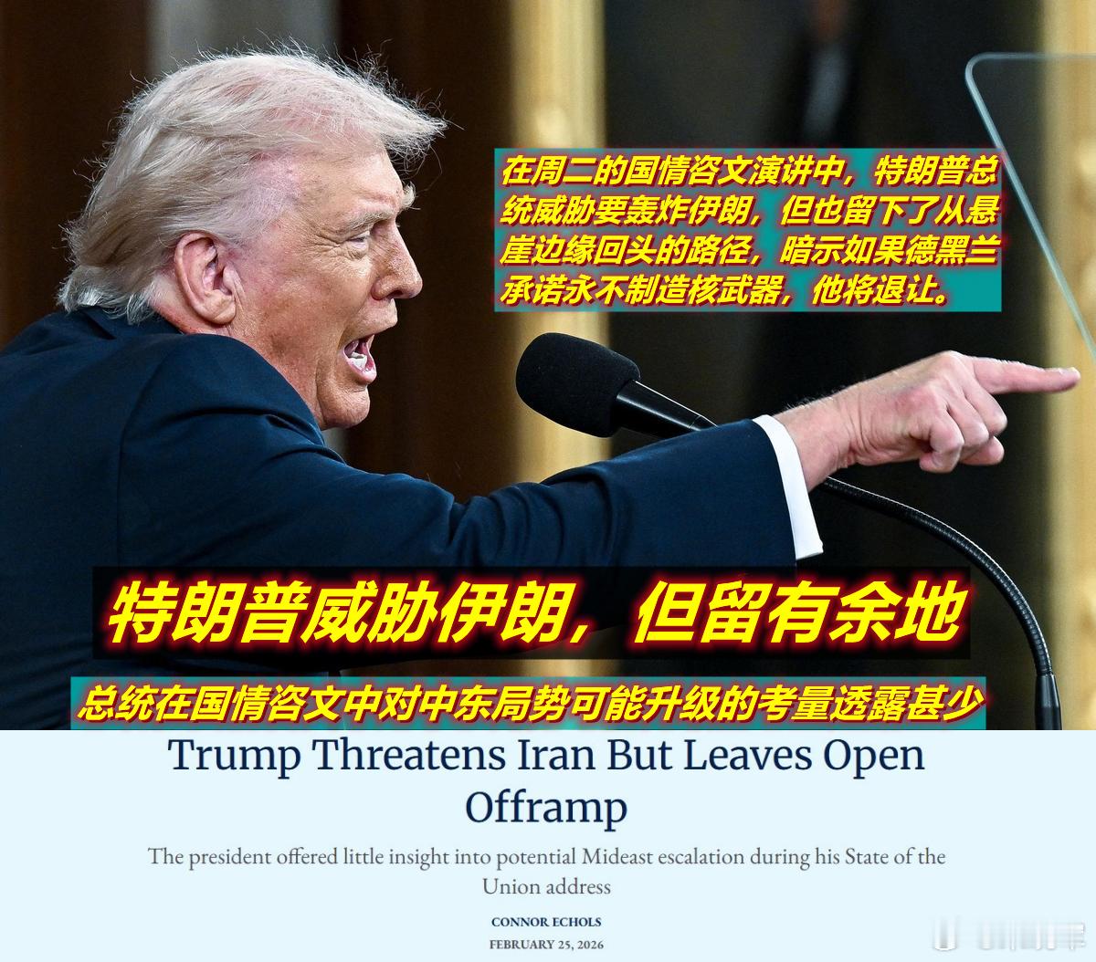 图1:去年6月“12日战争”是以色列先打为“午夜之锤”铺平了轰炸伊朗核设施的路;图2:“午夜之锤”过后特朗普马上主动宣布了停战;图3:而今年2月开始不断增兵威胁要大打伊朗;图4:今天凌晨又在“国情咨文”里留出了不打的“出口”。原来“本月23/24日开打”的传言,现在也不攻自破了。这是咋回事呢?