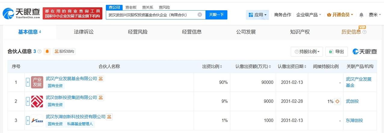 武汉武创兴汉股权投资基金登记成立 出资额10亿 天眼查App显示,近日,武汉武创兴汉股权投资基金合伙企业(有限合伙)成立,执行事务合伙人为武汉东湖创新科技投资有限公司,出资额10亿人民币,经营范围包括私募股权投资基金管理、创业投资基金管理服务、创业投资等,由武汉产业发展基金有限公司、武汉创新投资集团有限公司、武汉东湖创新科技投资有限公司共同出资。 天眼查信息: