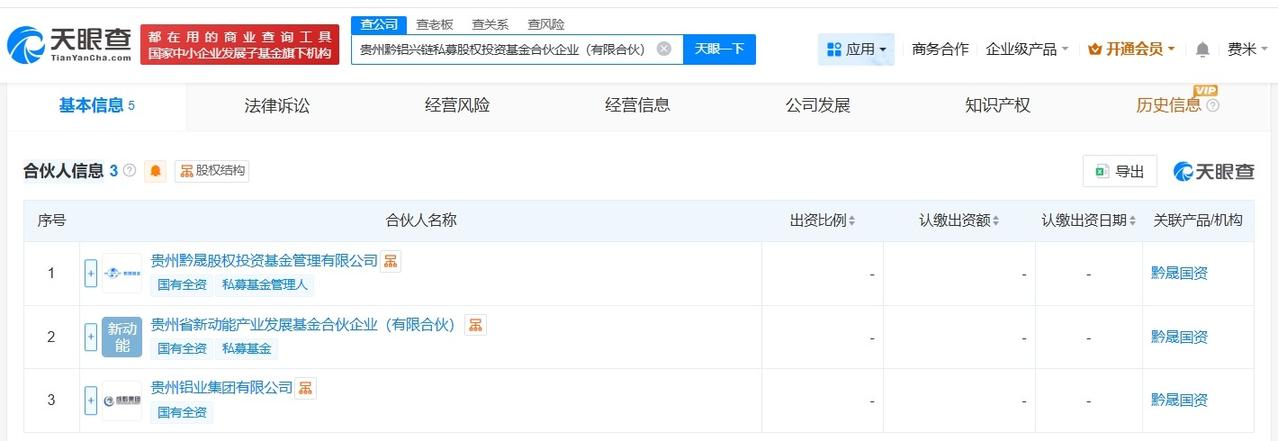 贵州铝业集团等成立私募股权投资基金 出资额20亿 天眼查App显示,近日,贵州黔铝兴链私募股权投资基金合伙企业(有限合伙)成立,执行事务合伙人为贵州黔晟股权投资基金管理有限公司,出资额20亿人民币,经营范围为私募股权投资基金管理、创业投资基金管理服务,由贵州黔晟股权投资基金管理有限公司、贵州省新动能产业发展基金合伙企业(有限合伙)、贵州铝业集团有限公司共同出资。 天眼查信息: