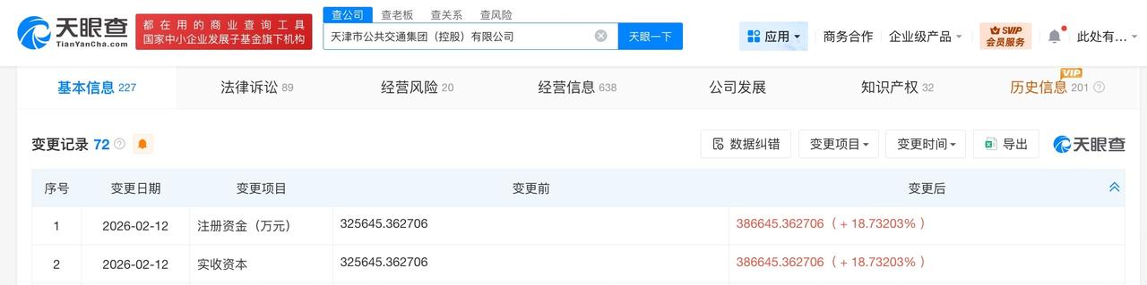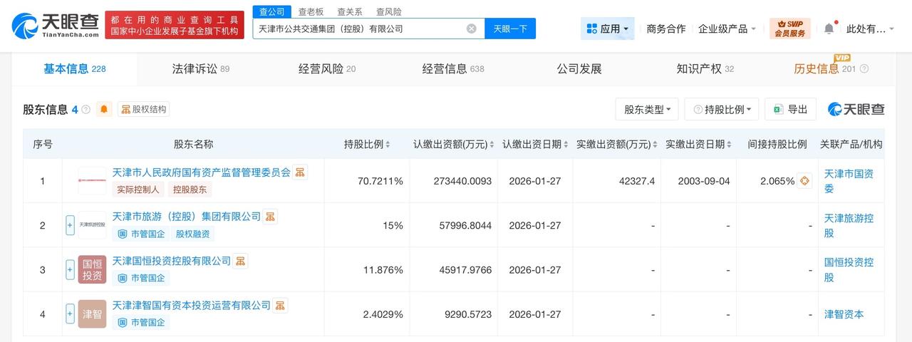 天津市公共交通集团增资至38.7亿 增幅约19% 天眼查App显示,近日,天津市公共交通集团(控股)有限公司发生工商变更,注册资本由约32.6亿人民币增至约38.7亿人民币,增幅约19%。 该公司成立于1986年8月,法定代表人为李洪刚,经营范围为市内公共汽车、出租汽车客运,汽车配件和汽车维修机具制造,机加工,广告,汽车租赁业务,普通货运,房屋租赁,由天津市人民政府国有资产监督管理委员会、天津市旅游(控股)集团有限公司、天津国恒投资控股有限公司、天津津智国有资本投资运营有限公司共同持股。 天眼查信息: