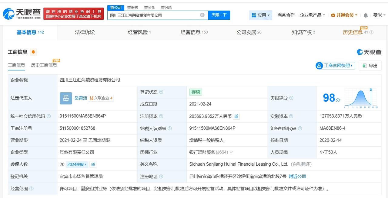五粮液集团入股四川三江汇海融资租赁公司 后者增资至约20.4亿 天眼查App显示,近日,四川三江汇海融资租赁有限公司发生工商变更,新增四川省宜宾五粮液集团有限公司为股东,同时,注册资本由约12.7亿人民币增至约20.4亿人民币,增幅约60%。 该公司成立于2021年2月,法定代表人为岳育洁,经营范围为融资租赁业务,现由宜宾发展控股集团有限公司及上述新增股东共同持股。 天眼查信息: