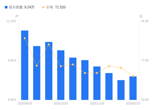 日期A股户数(户)流通A股户均持股数(股)户均持股市值(万元)2026-02-10923874399.6931.472026-01-20910454464.5433.242025-12-19935794343.6532.592025-11-28959114238.0330.772025-11-10981884139.7530.052025-10-31990754102.6931.032025-10-201016863997.3529.982025-09-301046673883.5032.142025-09-101031963938.8629.632025-08-291087273738.4831.78