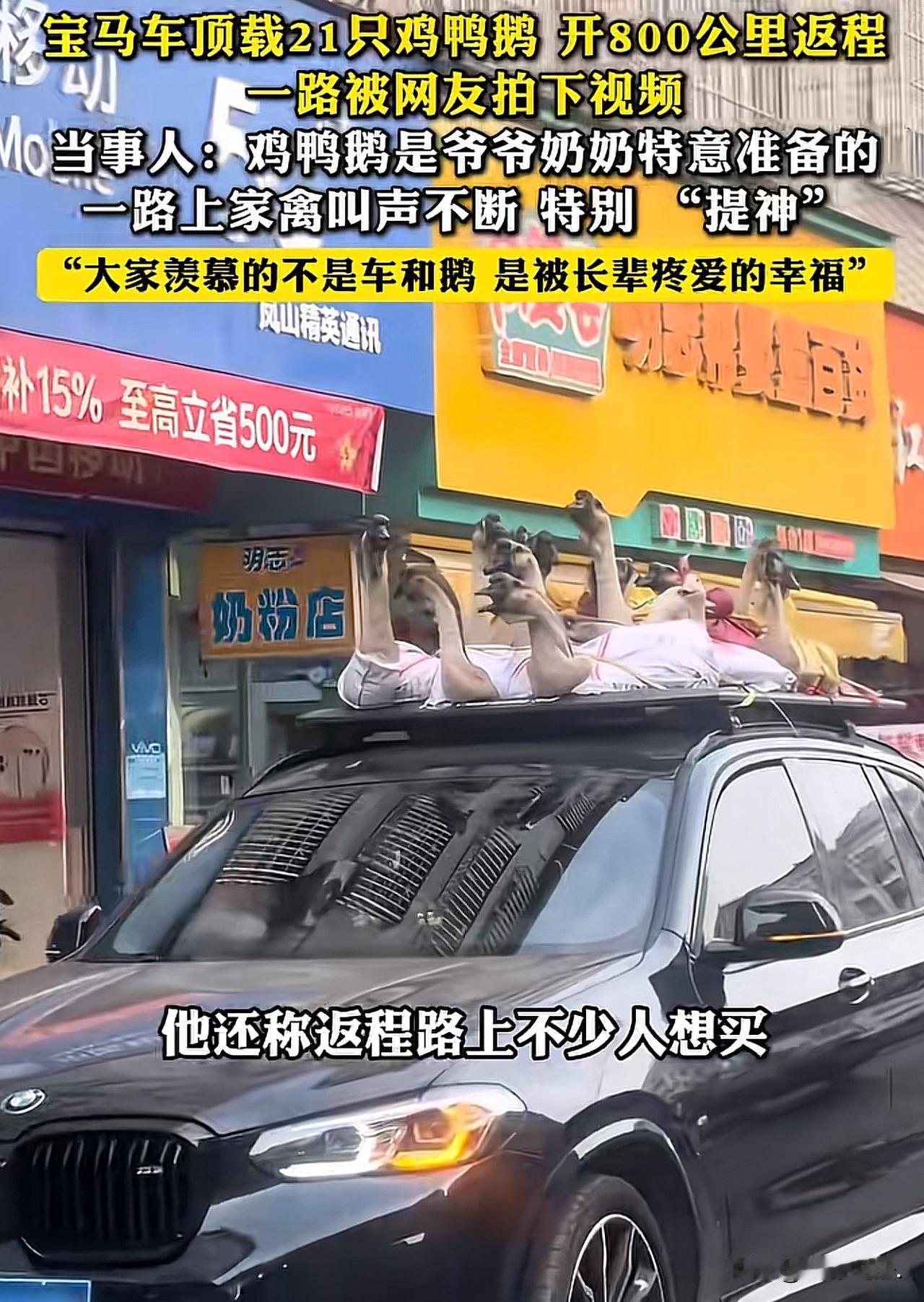 广西,一男子开着宝马车,车顶装了21只鸡鸭鹅,驱车800多公里,花了20多个小时返回广东,一路上被网友拍下视频,一路接力转发。途中不少人想买他车上的家禽,他都拒绝了,说这些都是爷爷奶奶专门为他准备的,藏着老人的疼爱,给多少钱都不卖。他还自豪地说,大家羡慕的不是车,也不是这些鸡鸭鹅,而是自己被长辈疼在心里的幸福。最终21只家禽平安到达广东,全都活蹦乱跳,他打算挖个鱼塘,把鸡鸭鹅好好养起来。 2月23日天刚蒙蒙亮,广西博白的乡间小路上就飘着淡淡的烟火气。 张先生要开着宝马车返回广东工作,爷爷奶奶早早就起了床,把家里最肥壮的家禽一一清点好。 十七只雪白的大鹅,两只土鸡,两只土鸭,整整二十一只,安安稳稳地放在宝马车顶上,用粗实的绳子一圈圈细心绑牢。 老人站在车旁,一遍遍叮嘱,说这些都是自家散养的,吃的是五谷杂粮,喝的是村口清水,带回去不管是吃还是养,都是家里的一点心意。 阳光洒在老人布满皱纹的脸上,也洒在车顶叽叽喳喳、摇摇摆摆的家禽身上,暖融融的。 车子缓缓驶上公路,立刻成了路上最惹眼的风景。 八百多公里的路程,二十多个小时的奔波,车顶上的鹅鸣、鸡叫、鸭啼此起彼伏,清脆又热闹,伴着车轮滚滚向前,驱散了长途驾驶的疲惫。 服务区里、收费站旁,总有路人停下脚步,笑着拿出手机拍摄,网友们一路接力,把这辆载着乡情的宝马,从广西一路传到了广东。 一路上,不少路人好奇地围过来,主动出价想买走这些鲜活的鸡鸭鹅,张先生都笑着摆了摆手,婉言谢绝。 这些带着家乡温度的小生灵,是爷爷奶奶攒了许久的疼爱,一分一毫都舍不得换。 平安到家时,天色已经暗了下来。张先生轻轻将车顶的鸡鸭鹅抱下来,二十一只小家伙全都精神抖擞,活蹦乱跳,一点没有路途的疲惫。看着眼前热闹的一幕,他心里满是踏实与温暖。 他说,旁人羡慕的从不是宝马车,也不是车顶的家禽,而是这份被长辈放在心尖上、倾尽所有疼爱的幸福。 接下来,他要在家门口挖一口小小的鱼塘,把这些大鹅好好养起来。 往后每一次看见它们摇着脖子走来走去,就会想起博白的老家,想起清晨里爷爷奶奶挥手的身影,想起那份藏在烟火气里,绵长又厚重的爱。 网友调侃: 鸡鸭鹅:生平第一次免费坐宝马车旅游,值了! 后备箱塞不下,车顶来凑,中国人的返程,永远逃不过长辈的“强行投喂”! 这大概是宝马最特别的用途了。21只鸡鸭鹅全程“VIP敞篷座驾”,一路鸡鸭鹅叫相伴,800公里平安到家! 欢迎关注@解豸说法.