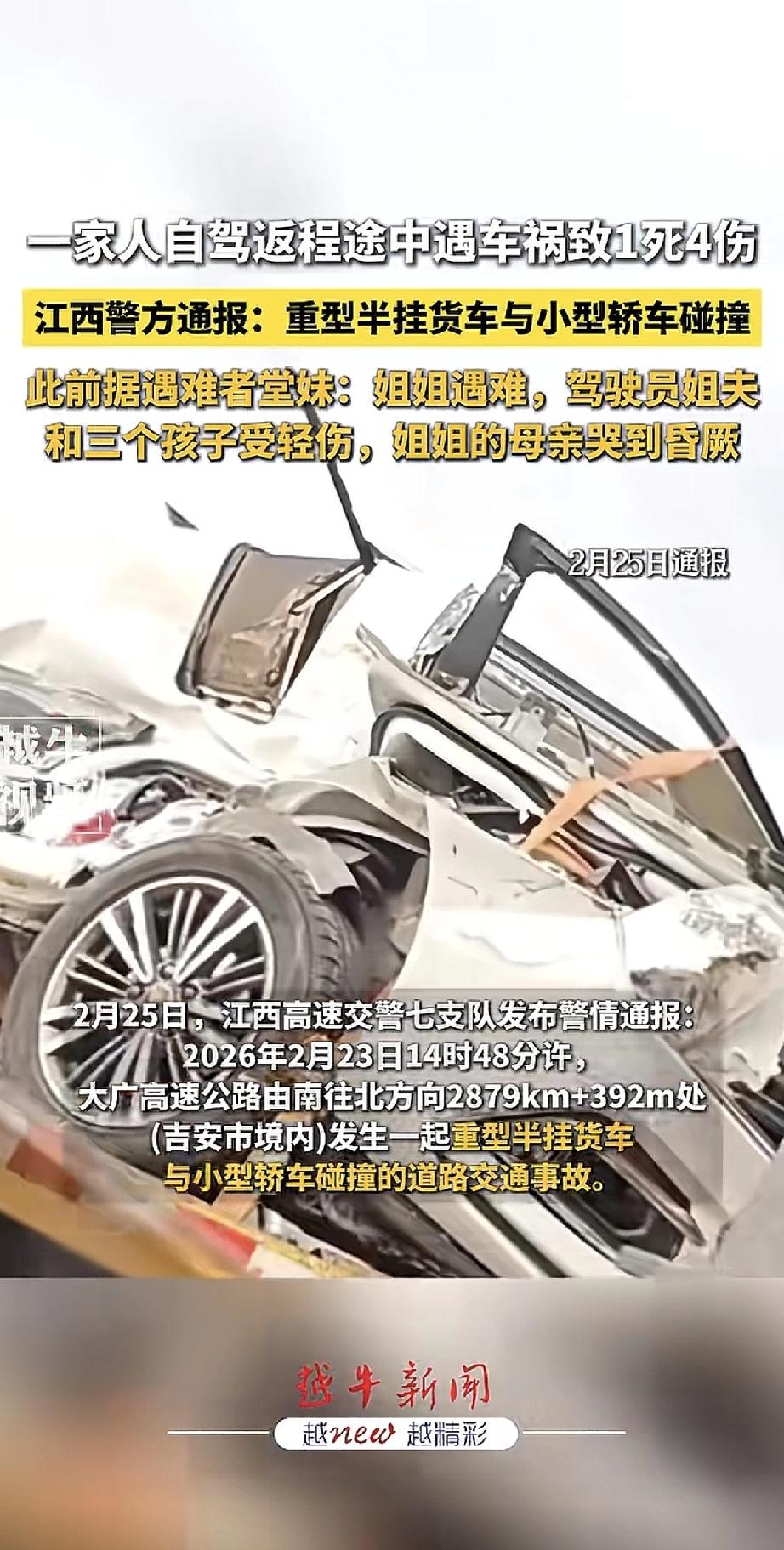 2月23日下午,大广高速吉安段发生一起惨烈车祸:一辆重型半挂货车与一辆小轿车相撞,导致4人死亡、4人受伤。 据遇难者亲属透露,车上是一家人自驾返程,姐姐不幸遇难,驾驶员姐夫和三个孩子受轻伤。噩耗传来,遇难者的母亲当场哭到昏厥。 返程路上,本该是带着团圆后的满足奔赴新一年的生活,却在一瞬间阴阳两隔。一次事故,夺走了四条生命,也击垮了一个家庭。目前事故原因正在调查中。 开车在路上,平安是最近的路。愿逝者安息,生者坚强。也提醒所有驾驶人:返程路上,安全第一。