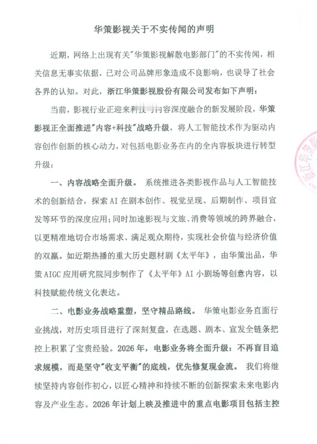 华策影视发声明 华策影视发声明回应不实传闻,表示相关信息无事实依据。华策影视表示正在推进“内容+科技”战略升级,将对包括电影板块在内的全内容板块进行转型升级。声明还提及2026年电影业务将坚守“收支平衡”底线,优先修复现金流。