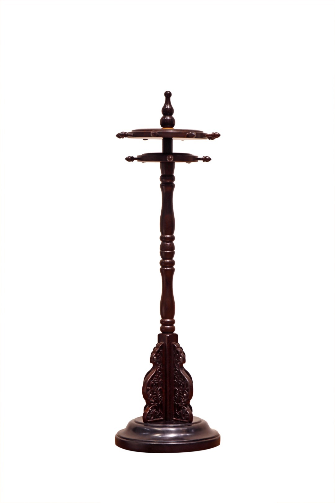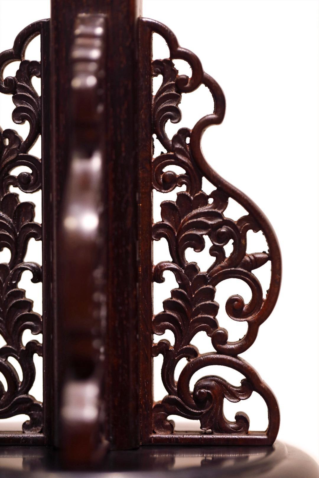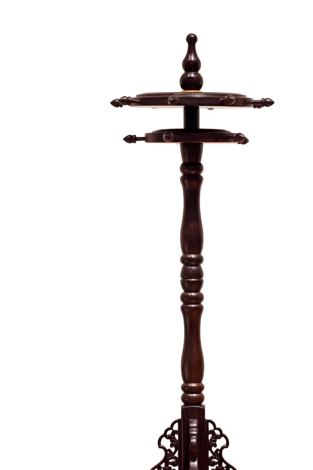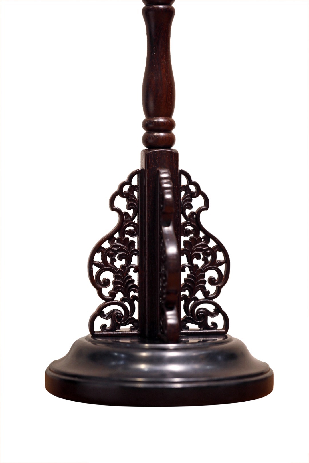 仿密宗法轮形制,装饰错落有致;立柱可拆卸,站牙镂雕卷草纹,兼具实用、装饰、赏玩之效。