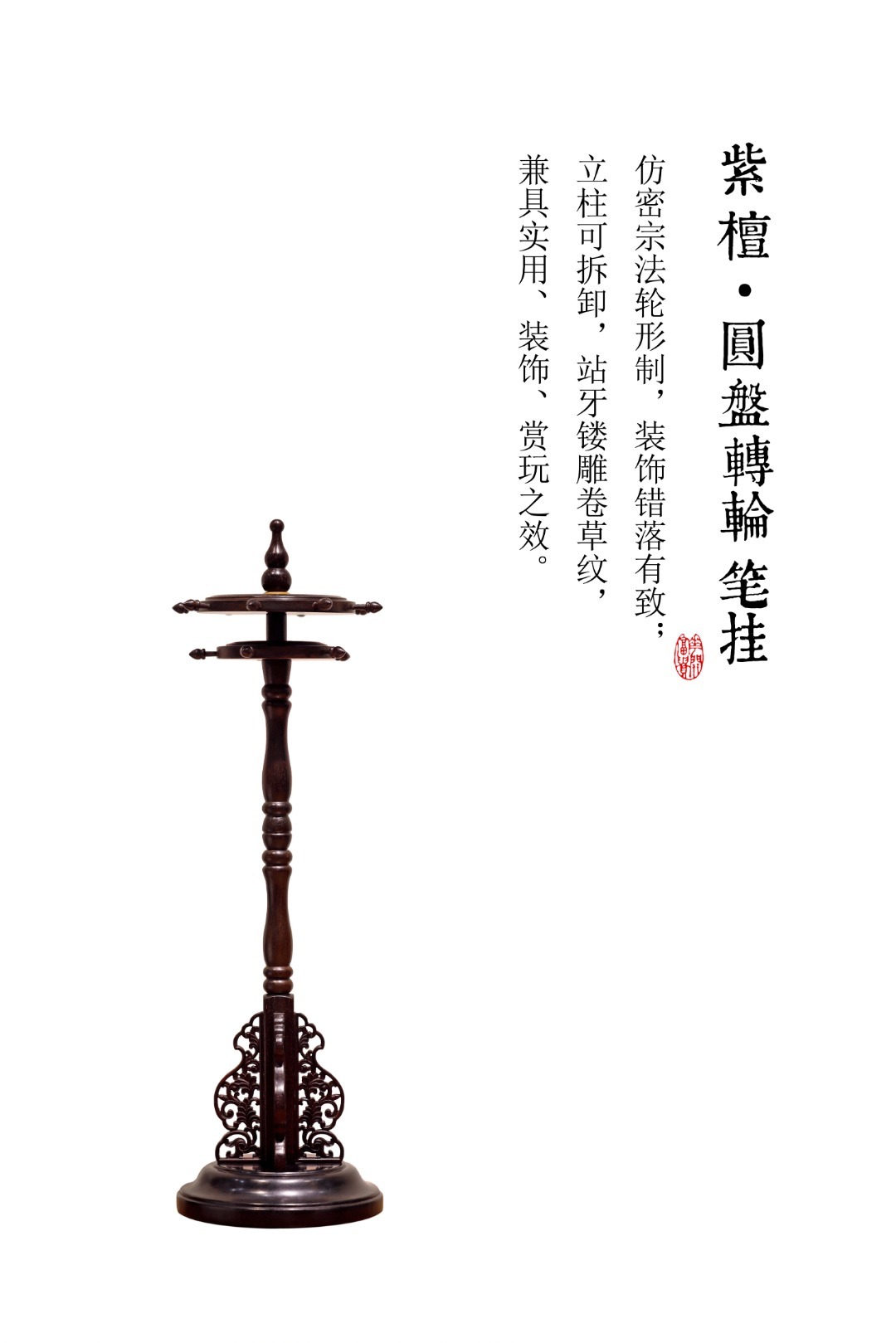 紫檀【圆盘转轮】笔挂仿密宗法轮形制,装饰错落有致;立柱可拆卸,站牙镂雕卷草纹,兼