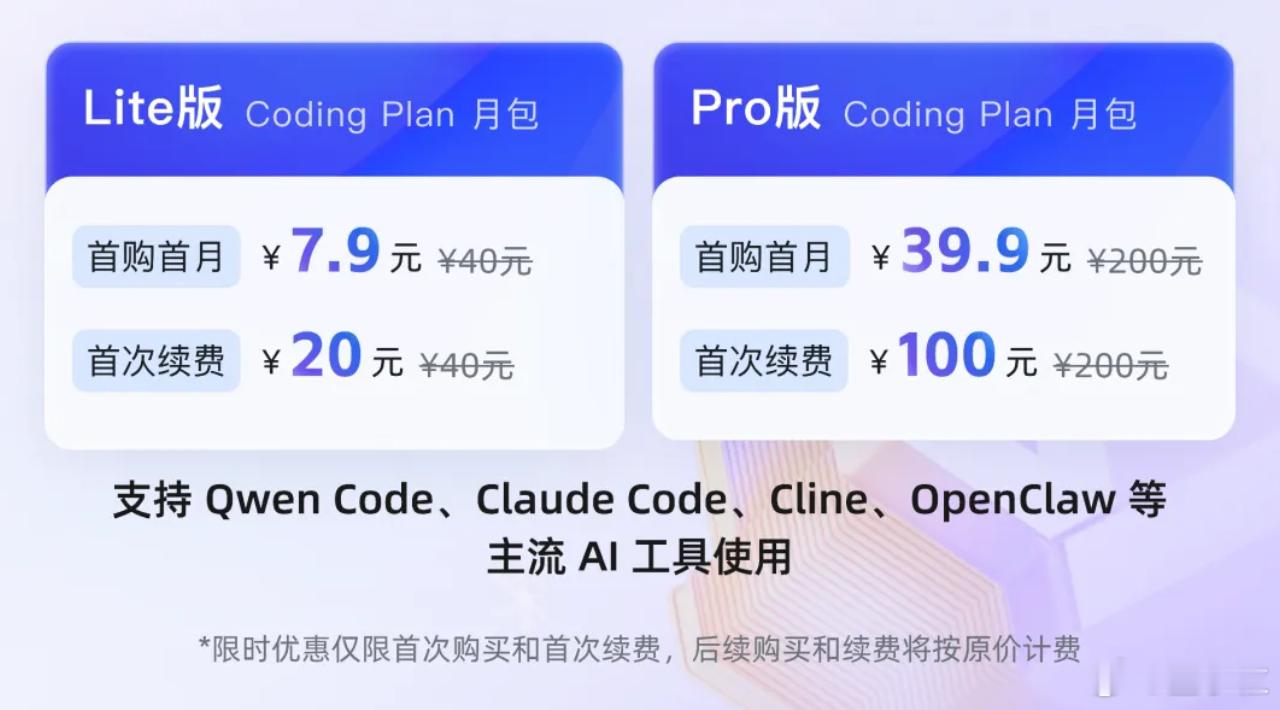 Token量大管饱,新用户低至首月7.9元,即可在Qwen Code、Claude Code、Cline,以及最近大火的OpenClaw等工具间无缝切换顶级模型。