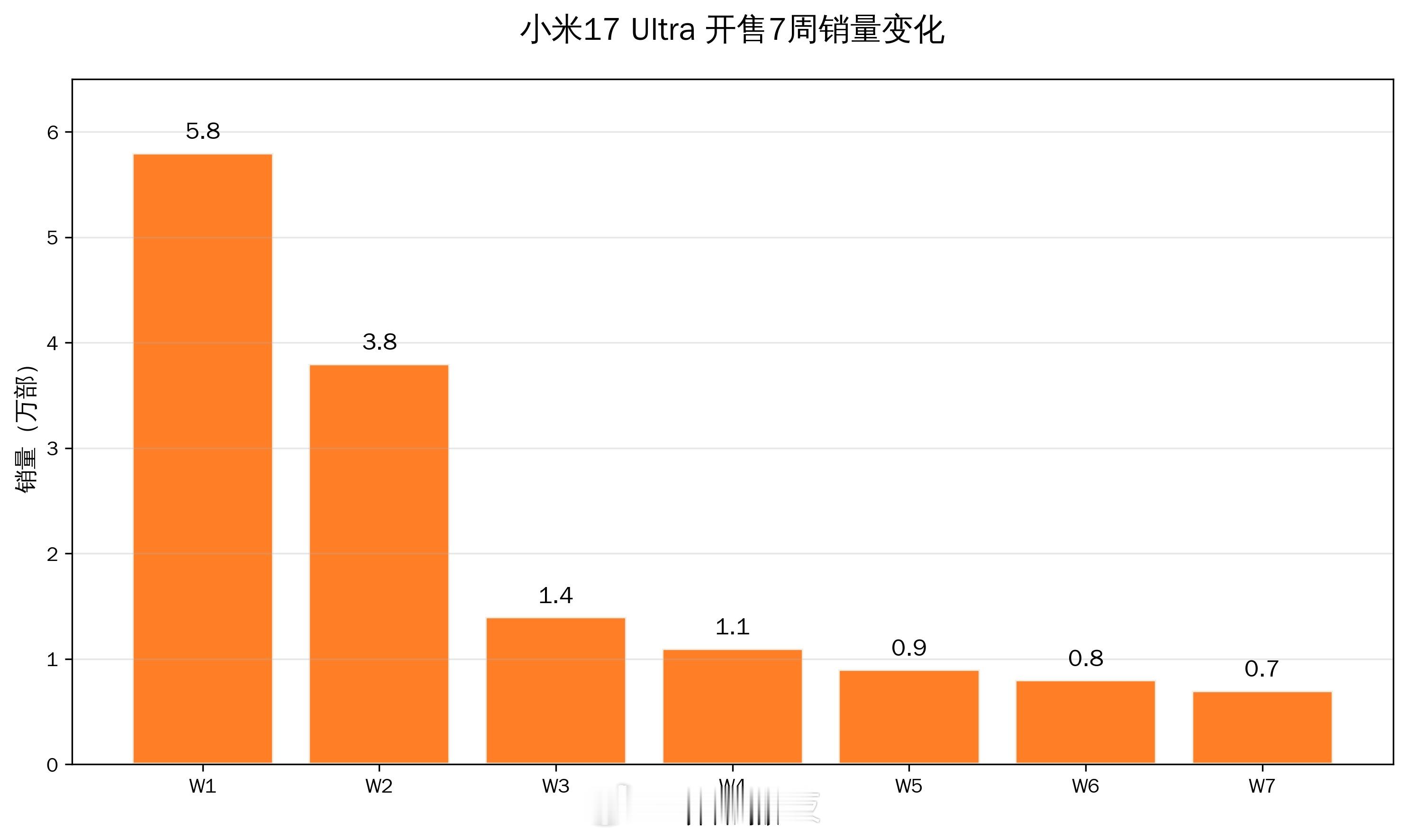 小米17 Ultra开售7周销量增长变化:w1,5.8万w2,3.8万w3,1.4万w4,1.1万w5,0.9万w6,0.8万w7,0.7万
