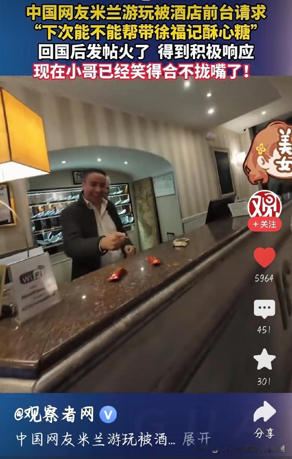 笑疯!米兰酒店前台追着中国游客要糖,这波文化输出太接地气 中国网友去米兰旅游