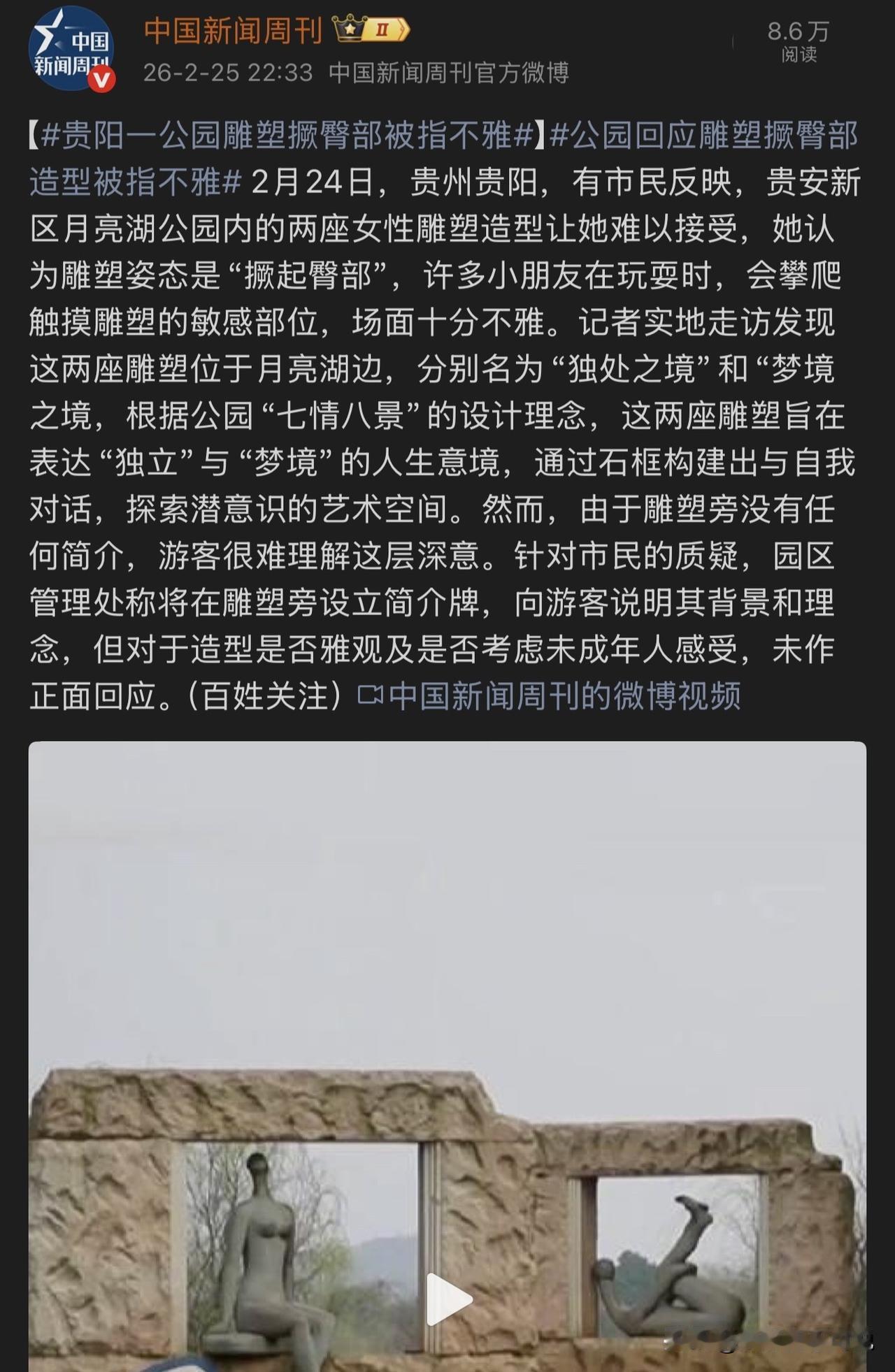 贵阳两座女性雕塑被疑不雅后引来热议,是雕塑问题还是市民的问题?在贵阳贵安新区月亮湖公园内的两座没穿衣服的女性雕塑造型,有女性市民认为雕塑姿态是“撅起臀部”,许多小朋友在玩耍时,会攀爬触摸雕塑的敏感部位,场面十分不雅。我看了一下这两座雕塑,不管是哪一座都没啥大问题,毕竟艺术这东西不一定非要裹得严严实实。那这是女性市民的问题?当然不是,大家注意这位女性描述的场景,是孩子爬到敏感部位上会显得不雅!所以这事儿既不是雕塑问题也不是该女性市民问题。那是谁的问题呢?我认为是雕塑摆放的地方出了问题,为什么不把雕塑摆放在人触摸不到的地方呢?