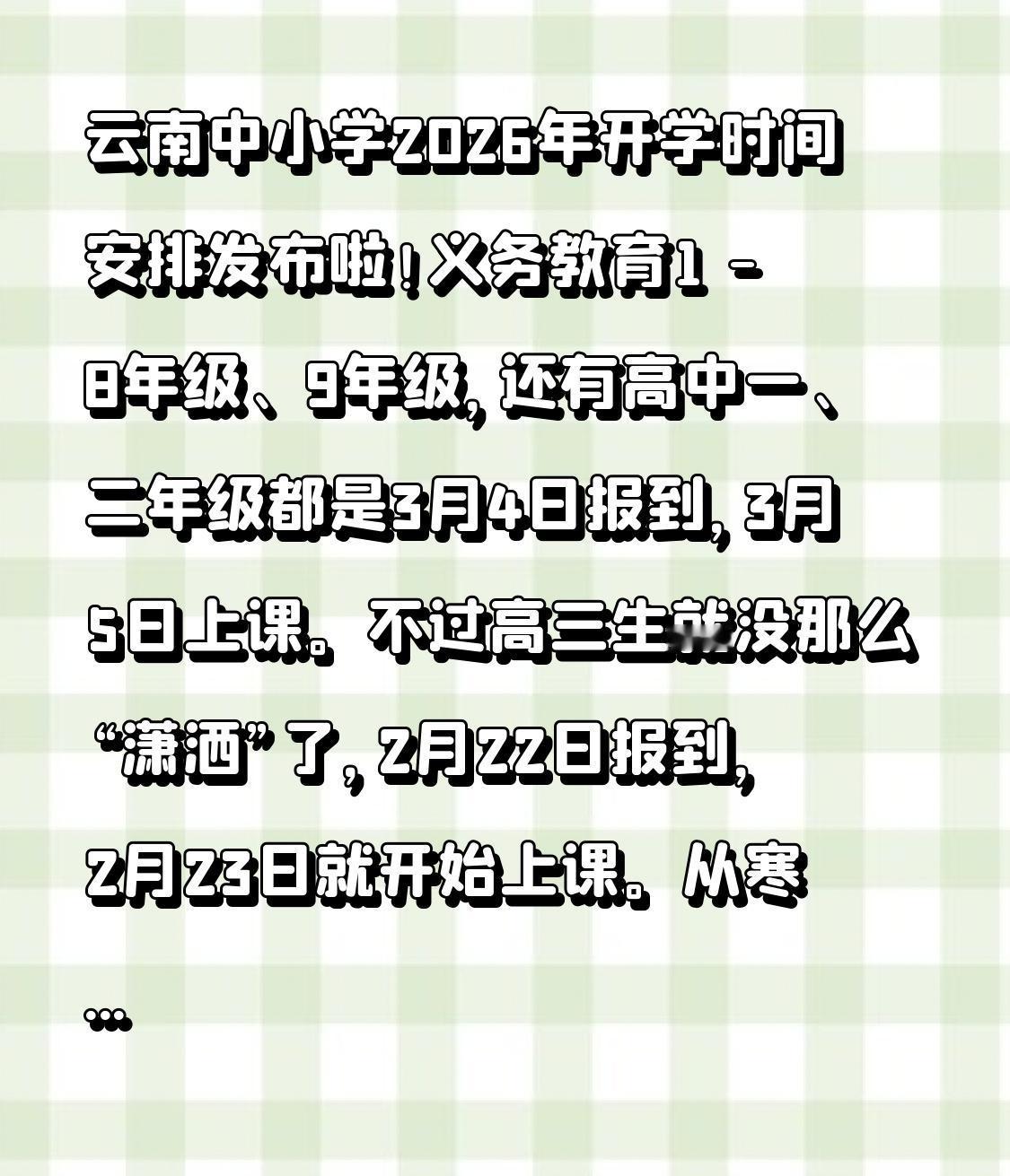 云南中小学2026年开学时间安排公布啦! 依据云南省《2025—2026学年普通中小学校教学日历》,开学时间如下 ↓↓↓ 义务教育阶段,1 - 8年级、9年级,以及高中一、二年级均于3月4日报到,3月5日正式上课。 然而,高三学生可没那么“自在”,他们需在2月22日报到,2月23日便开始上课。 从寒假时长来看,义务教育1 - 8年级最迟1月24日放寒假,9年级、高中一、二年级以及高三最迟2月7日放寒假。 这样的安排对于高三学生而言,寒假明显缩短了不少,毕竟高考的压力摆在那儿。不同年级不同的开学与放假时间,也反映出各学习阶段的不同需求。 2026开学季 2026开学 云南寒假时间 云南 寒假