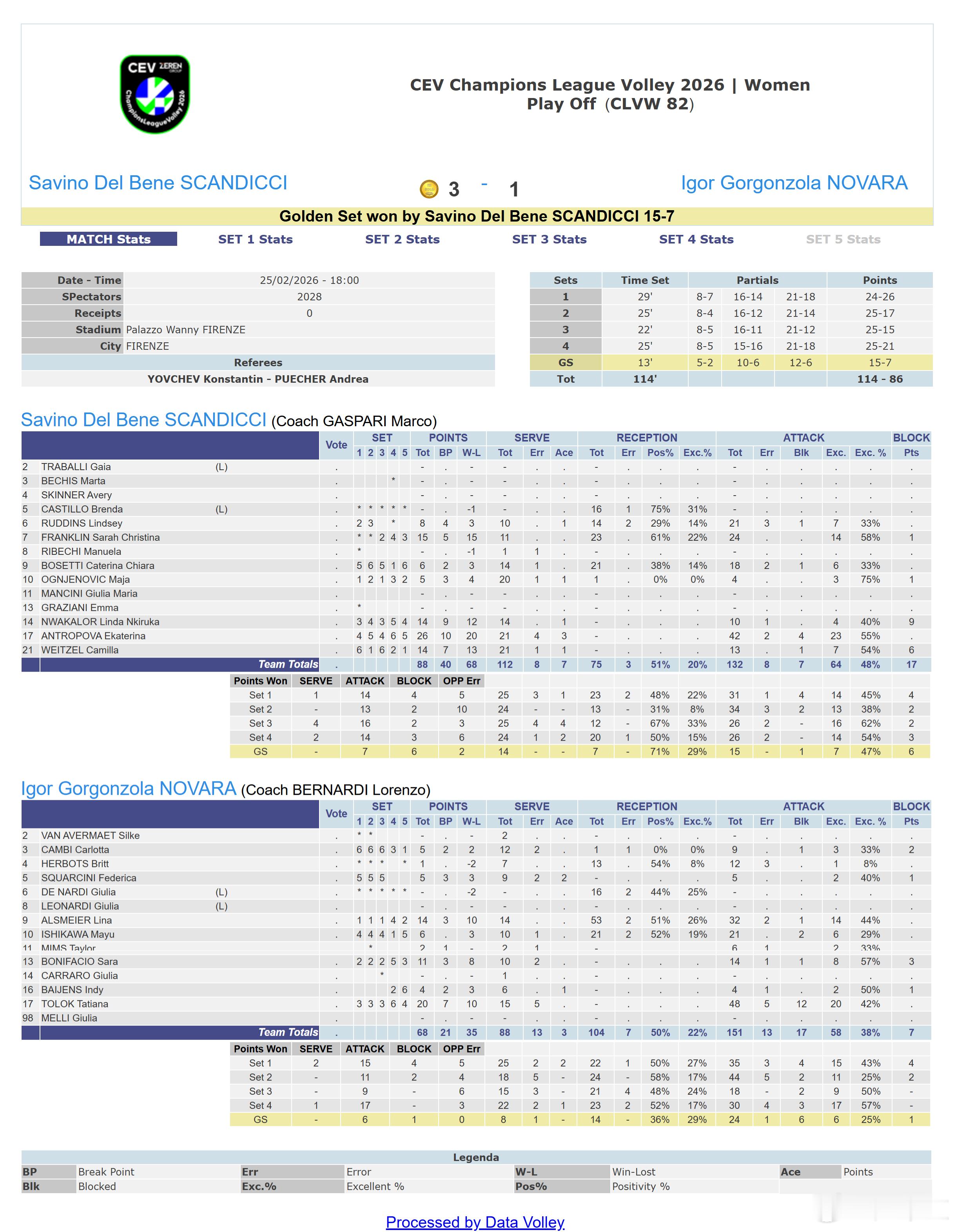 国际排坛动态斯坎迪奇次回合:斯坎迪奇 3-1(24-26/25-17/25-15/25-21)诺瓦拉;金局:斯坎迪奇15-7诺瓦拉;斯坎迪奇晋级,女排欧冠1/4决赛对手将会是费內巴切。瓜姐MVP斯坎迪奇-诺瓦拉扣球:64-58;拦网:17-7;发球:7-3;自失:18-26安特罗波娃26分 42扣23中 3发;富兰克林15分 24扣14中 1拦;L.恩瓦卡洛14分 10扣4中 9拦1发;维特策尔14分 13扣7中 6拦1发;鲁丁斯8分 21扣7中 1发;小菠菜蒂6分 18扣6中;奥杰年诺维奇5分 4扣3中 1拦1发意大利🇮🇹诺瓦拉队:卡多奇金娜20分 48扣20中;阿尔斯迈尔14分 32扣14中;博尼法西奥11分 14扣8中 3拦;石川真佑6分 21扣6中;斯夸尔奇尼5分 5扣2中 1拦2发;坎比5分 9扣3中 2拦;拜延斯4分 4扣2中 1拦1发;米姆斯2分 6扣2中;赫博茨1分 12扣1中诺瓦拉