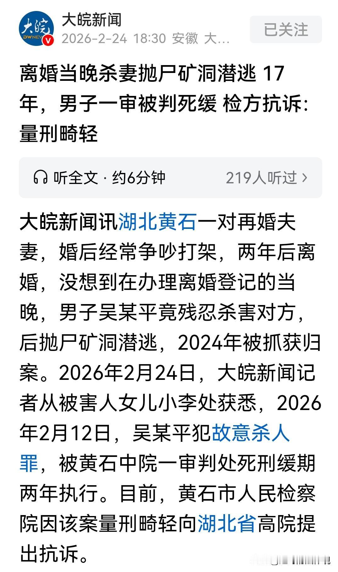 不可饶恕!湖北大冶,女子带两个女儿二婚嫁给一开摩的男子,两年后离婚。可就在离婚当天,前夫将女子杀害,并扒下她的衣服后抛尸矿洞,之后跑没了影。直到17年后终于被抓获归案,2月12日,法院判决,男子犯故意杀人罪,判处死刑,缓期两年执行。当地检方认为量刑畸轻,向高院提出抗诉。 2026年2月12日,法院判决吴永平死刑,缓期两年执行。 晓秀(化名)为了这一天,她等了17年。 2007年8月31日晚上,她的母亲高寒(化名)死了。 那天上午,高寒和吴永平刚办完离婚手续。 两人2005年6月结婚,这段婚姻只维持了两年多。 离婚协议上写着:结婚期间共同建的房子归高寒,高寒当场付给吴永平4万块钱。 当天晚上10点多,高寒回到自己家,吴永平在收拾东西,两人发生争吵。 吴永平说:两人扭打起来,他把高寒推倒,她后脑勺撞到墙上。 他又捡起扳手朝她后脑勺打了一下。 高寒转身抓他下体,他疼得受不了,用双手掐她脖子让她松手,高寒没松。 他左手揪住她头发,右手拿起床头柜上的水果刀,朝她脖子上捅了一刀。 高寒倒在地上,他在旁边等了十几分钟,看她不动了,觉得她死了,就用摩托车把尸体运到一个废弃矿洞里扔掉。 第二天凌晨,吴永平去了他母亲家,告诉她自己杀了人,然后逃跑了。 2007年9月2日,高寒的姐姐报案。 说妹妹高寒和妹夫吴永平都失踪了,妹妹家里有血。 警方在现场勘查,找到一把粘着血迹的扳手,窗户和墙上也有血迹。 11月9日,在一个废弃煤矿的矿洞里,发现了高寒已经高度腐败的尸体。 死亡分析意见:应系机械性损伤死亡,不能排除机械性窒息死亡。 晓秀后来看到了母亲遇害前的样子。 遗体上有很多处伤痕,颈动脉被割断。 高寒离世的时候年仅39岁。 她丈夫去世得早,一个人开理发店,拉扯两个女儿。 晓秀13岁,姐姐15岁。 2007年5月,高寒突然让晓秀别上学了,把她送到武汉找姐姐。 她没解释为什么,后来晓秀才明白,母亲是怕吴永平伤害她。 把女儿送走3个月后,她自己遇害了。 晓秀和姐姐被推出家门后,日子过得很苦。 没饭吃,没新衣服,饿着肚子到处找活干,在店里当学徒,什么脏活累活都干过。 母亲死后,晓秀去查家里的房产。 她发现吴永平早就把房子偷偷转走了。 他办了假的单身证明,改了房产证,把自己名字写上去,还把他死去的前妻和他儿子的名字也加上。 那是母亲挣钱盖的房子。 晓秀花了很长时间,打了很多官司,才把那套房子要回来。 母亲死的时候,在她衣服里找到一封遗书。 落款日期是2007年6月,写着把遗产都给两个女儿,还注明“绝笔”两个字。 她知道自己可能活不成了。 吴永平跑了,其实没跑多远,时不时还回老家。 警方一直没放弃追捕,通缉令发了一期又一期。 2019年当地警方的网上追逃名单里,第一期第一个就是吴永平。 2024年8月19日,吴永平在河南被抓获。 晓秀接到电话的时候正在睡觉,一下子从床上跳了起来。 17年了,她终于等到这一天! 可等来的判决,让她接受不了。 2026年2月12日,一审宣判:吴永平犯故意杀人罪,判处死刑,缓期两年执行。 吴永平在法庭上翻供,他说是赤手空拳,没拿东西打人。 打完以后高寒说她不想活了,他去了趟厕所,回来就看见她躺在地上,脖子上插着刀,是她自己割的。 法院并没采信他的这个说法。 判决书写着:本案系婚姻矛盾纠纷引发,在量刑时酌情考量。 晓秀想不通,母亲是发现吴永平出轨、家暴,才要离婚。 他就威胁,说要杀了她。 这话他跟亲戚说过,也在镇上到处散布过。 离婚前,他还偷偷把房产转走了。 这叫婚姻家庭矛盾?矛盾在哪? 谁跟谁有矛盾?都离完婚了还有什么矛盾? 判决第二天,检察院向省高院提出抗诉。 抗诉书里写了3点理由: 第一,被害人高寒对矛盾激化没有直接责任。 第二,被告人和被害人在案发前已经离婚,解除了婚姻关系。 第三,被告人犯罪情节特别恶劣,杀人后抛尸,潜逃多年才被抓获,归案后拒不认罪悔罪,没有赔偿被害人家属,没有任何从轻情节。 检方的结论是:一审量刑畸轻。 晓秀说,她不要赔偿。她只要一个公道。 《刑法》第232条:故意杀人的,处死刑、无期徒刑或者十年以上有期徒刑; 情节较轻的,处3年以上10年以下有期徒刑。 本案中,吴永平用扳手击打、双手掐颈、水果刀捅刺等手段将高寒杀害,之后还抛尸矿洞,行为极其残忍,主观恶性极大。 其行为完全符合故意杀人罪的构成要件。 应在“死刑、无期徒刑或者十年以上有期徒刑”这个量刑区间内量刑。 一审法院考虑到本案系婚姻矛盾纠纷引发,判处其死刑,缓期两年执行。 但检方认为,被害人对矛盾激化无直接责任。 且双方已离婚,吴永平犯罪情节恶劣,无任何从轻情节,一审量刑畸轻,提出抗诉。 对此你怎么看?