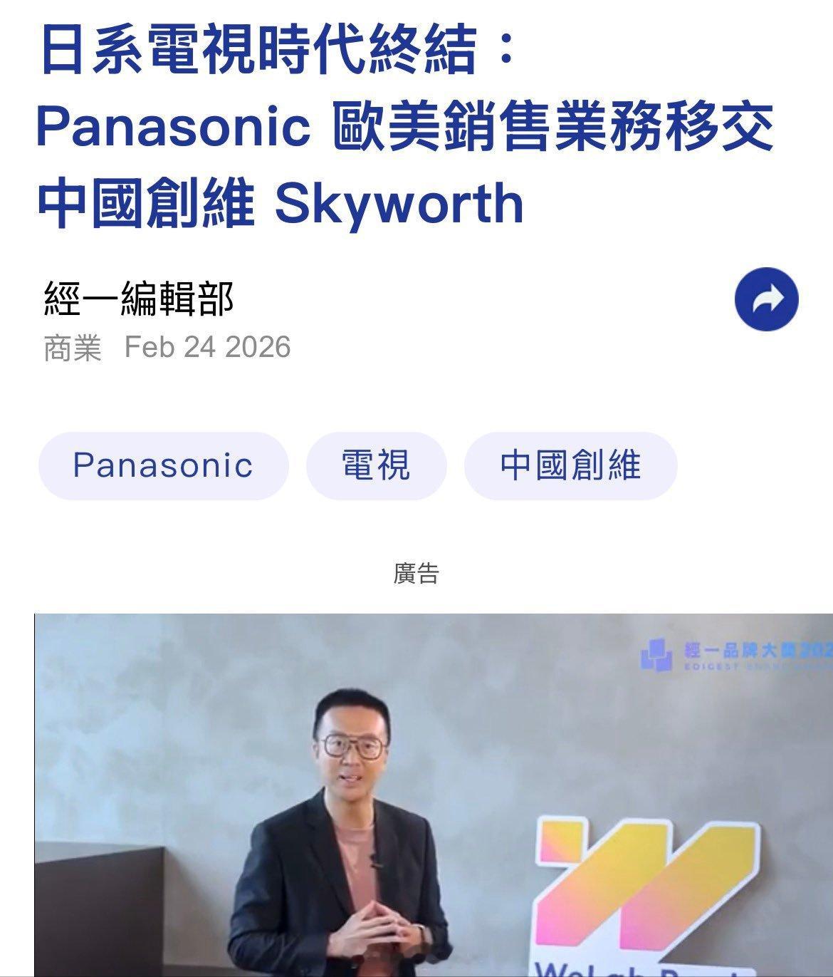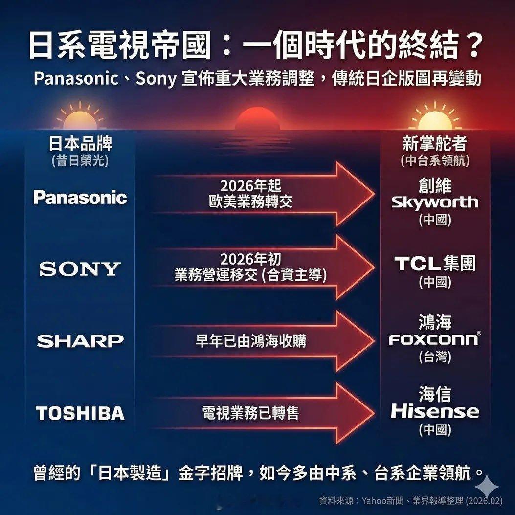 2月24日日本家电巨头松下宣布:将北美及欧洲地区电视业务全面移交中国家电企业创维这是继今年1月索尼宣布将电视业务交由TCL主导后,今年第二家日本家电企业把业务移交到中国企业。而早走前几年,日本家电巨头东芝、三洋分别被中国的海信与海尔收购