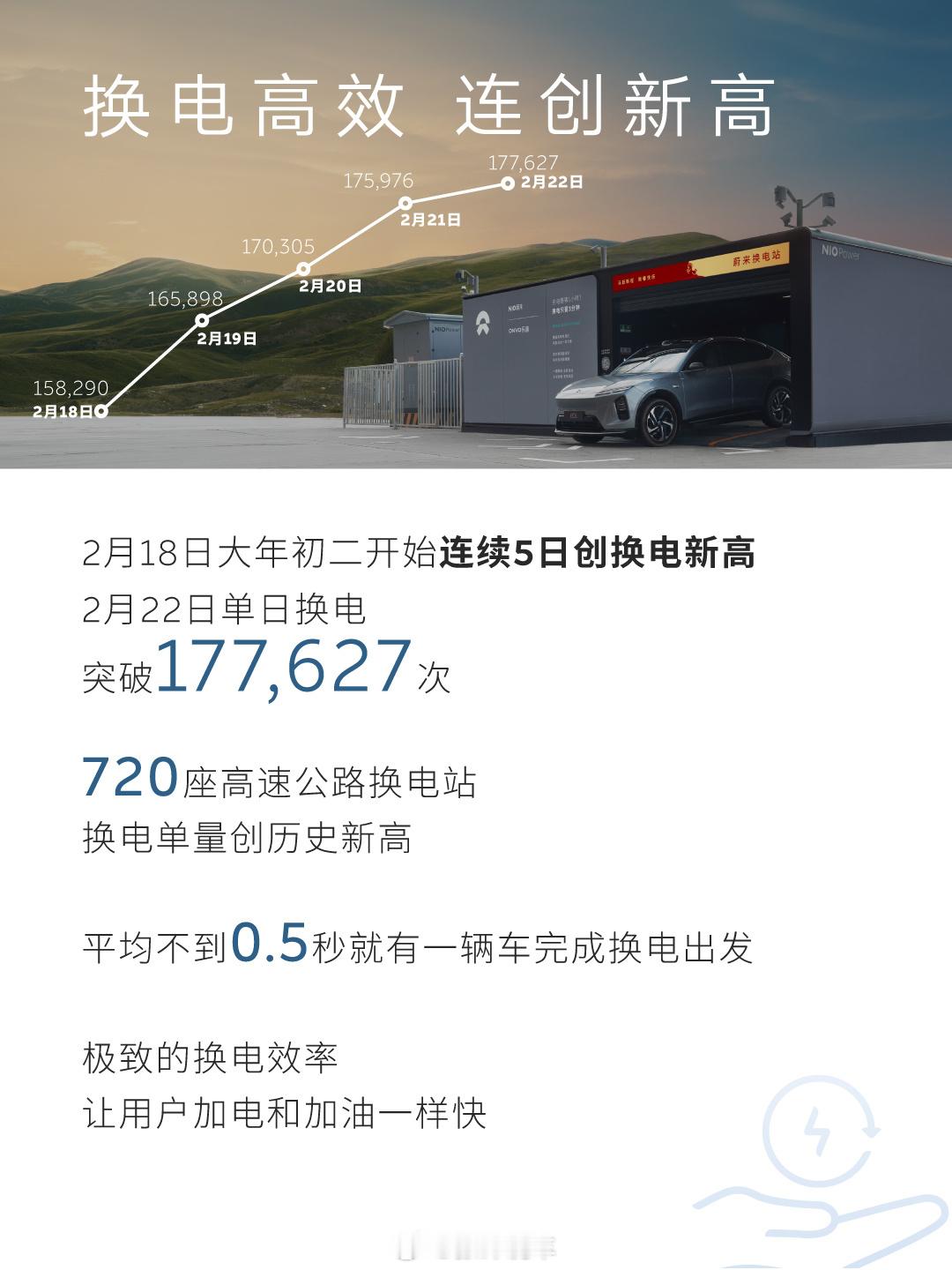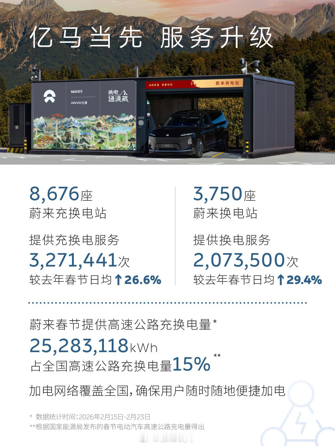 春节期间,蔚来遍布全国的8,676座充换电站(含3,750座换电站)累计提供充换电服务3,271,441次,其中换电服务达2,073,500次,日均服务量较去年春节显著提升。2月15日至2月23日,蔚来能源在高速公路充换电量累计超2528万kWh,占全国高速公路充换电总量15%。自2月18日(大年初二)起,蔚来换电连续5日刷新单日服务纪录,并在2月22日迎来新高,单日换电总量达177,627次,意味着平均不到0.5秒就有一辆车完成换电,让用户享受和加油一样方便的加电体验。蔚来汽车