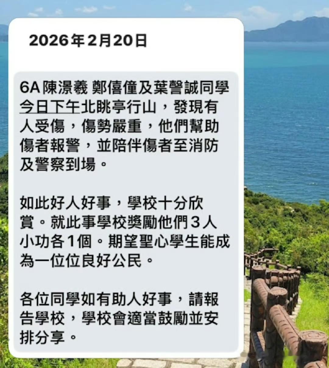 香港一名网友发帖称,她已经成年的弟弟上周五(20日)在长洲徒步时,在长洲家乐径观景台(北眺亭)附近滑倒受伤,左手骨折,下巴也被磕破,流了很多血。 随后有三名路过的小朋友帮忙报警,还清楚地告诉了警方准确的受伤位置。三名小朋友还给伤者递了一包紫菜零食为他打气,一直陪着他等待救护人员赶到,直到确认他被送上救护车才离开。“就因为这样,三位小朋友当天晚上回家吃饭都迟到了”。 她的弟弟在医院做完手术后情况稳定,“可他一醒来就一直惦记着这三位小朋友。如果没有他们当时的帮助和陪伴,后果真的不堪设想。” 姐姐说,非常感谢这三位“小英雄”和他们的家人,“想当面跟他们报个平安,也想告诉他们的父母,你们教出来的孩子真的非常勇敢,特别值得骄傲。” 伤者后来也亲自发文,衷心感谢这三位“救人小英雄”。他说,事发时现场没有其他路人,幸好遇到他们第一时间伸出援手。 “最让人感动的是他们处理事情非常冷静,在最短时间内清晰地向消防员和报案中心报出了山上的坐标数字,让救援人员能够快速锁定位置,以最快速度赶到现场,这种临危不乱的反应,就算是很多成年人都未必能做到。” 三名小朋友就读的长洲圣心学校随后留言回复,表示学校事发当天就已经得知此事,肯定了三名学生的善举,“对于这样的好人好事,学校十分赞赏”,并为三人各记一个小功。伤者家属也表示已经联系了学校,安排当面致谢的事宜。