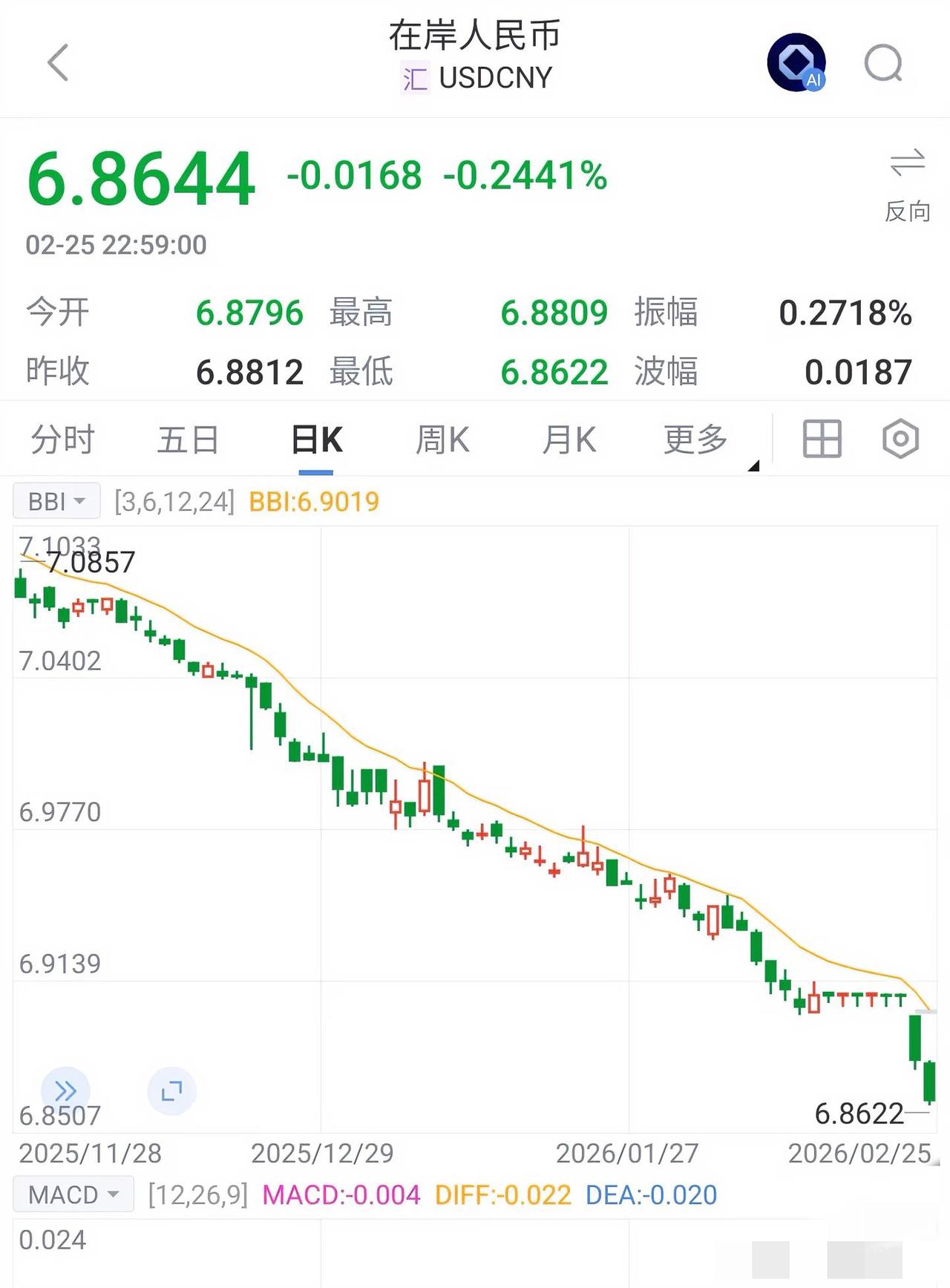 人民币对美元汇率升破6.87¹前几天一个博主强势预言人民币会持续贬值,兑美元到