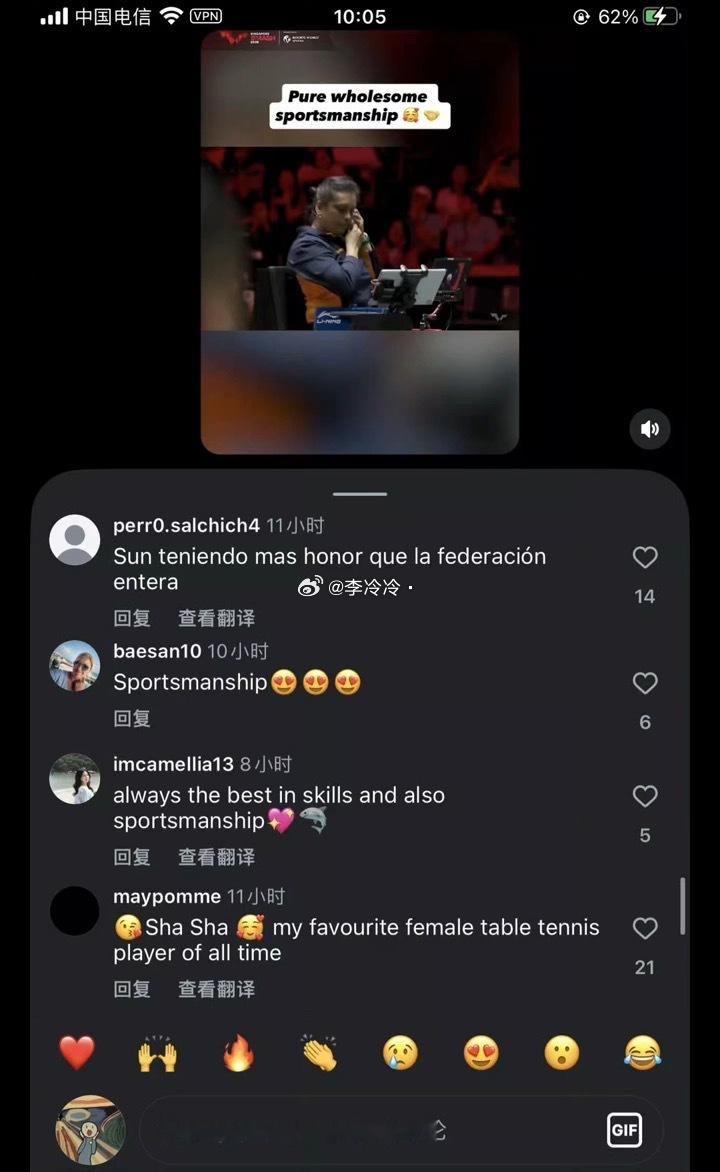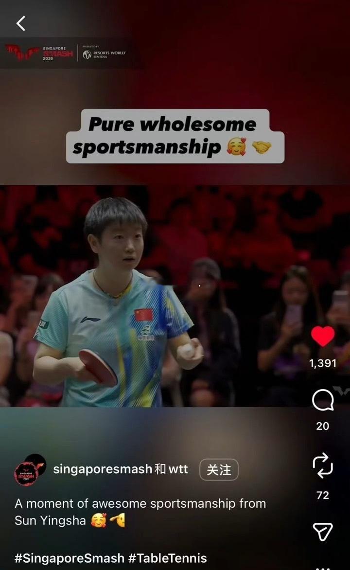 众多职业球员为孙颖莎行为点赞在2月25日晚场比赛中,孙颖莎一个小小的举动被官方认证点赞👍“Purewholesomesportsmanship"纯粹而高尚的体育精神“Amomentofawesomesportsmanship"fromSun Yingsha孙颖莎在这一刻诠释了伟大的体育精神!孙颖莎一次又一次用行动告诉大家竞技赛场上从不止实力与比分论输赢,还有输赢之外的初心底线!