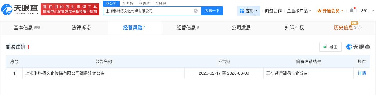 易梦玲名下公司拟注销 易梦玲持股公司拟注销 天眼查经营风险信息显示,近日,上海琳琳栖文化传媒有限公司新增一则简易注销公告,公告期自今年2月17日至3月9日。 该公司成立于2022年5月,法定代表人为易梦玲,注册资本50万人民币,经营范围包括组织文化艺术交流活动、广告制作、广告发布等,由易梦玲、吴燕芬共同持股。 天眼查信息: