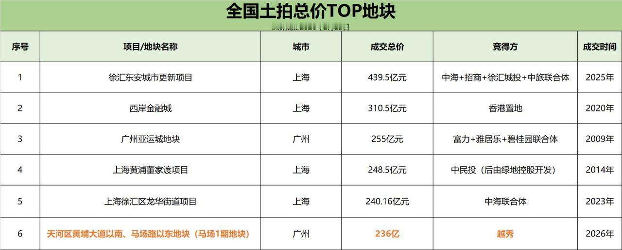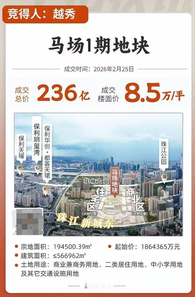【越秀拿下广州马场地块!保利却笑到最后】马年刚开年,广州率先上演一场全国瞩目的“史诗级土拍”:8家房企,鏖战9个小时、243轮竞价,珠城马场1期地块最终以总价236亿出让,折合住宅楼面价约8.5万/平,溢价率26.6%。 这场土拍创造了多项全新的记录: 广州最贵宅地,楼面价85687元/㎡ 未来可能要卖到15万/平才能保本 总价236亿广州第二(第一依旧还是为亚运城地块255亿) 耗时9个小时,243轮创造历史 刷新全国今年土拍总价记录,冲入全国土地出让历史总价TOP6 超10万人围观导致官网崩溃 根据介绍本次参与竞拍的房企共八家,包括:保利、越秀、珠实、招商、华润置地、广州城投、广州地铁、广州建筑。其中招商和华润只是陪跑,而保利和越秀才是主角,基本上后面都是两家开发商在争夺。 比较有趣的,虽然地块最终是越秀拿下,但是笑到最后的其实是保利。因为保利其实在马场地块周边手上有不少楼盘,把地价楼价给顶上去,其实对于保利来说百利无一害。而且之前传说这个地块就是ND越秀,因此保利这次颇有点做局抬价的意思。而越秀这次拿下这个地块之后,相信接下来大半年估计都没什么弹药了,而保利在接下来的广州一整年的土拍中可以笑傲江湖了。 而反观越秀这边,虽然拿了个头彩但是其实增加了变数。要知道其实这几年越秀的财务并不乐观,马场这个地块看着虽然金碧辉煌,但是实则最赚钱的住宅并不多,打高端豪宅路线,其实越秀并没有什么优势。 加上还有各种商业引入和公园配建。其实越秀真正拿下的,是一个十分消耗精力的大麻烦,而且一不小心还有可能变成一个”lei“或者是那根”稻草“。