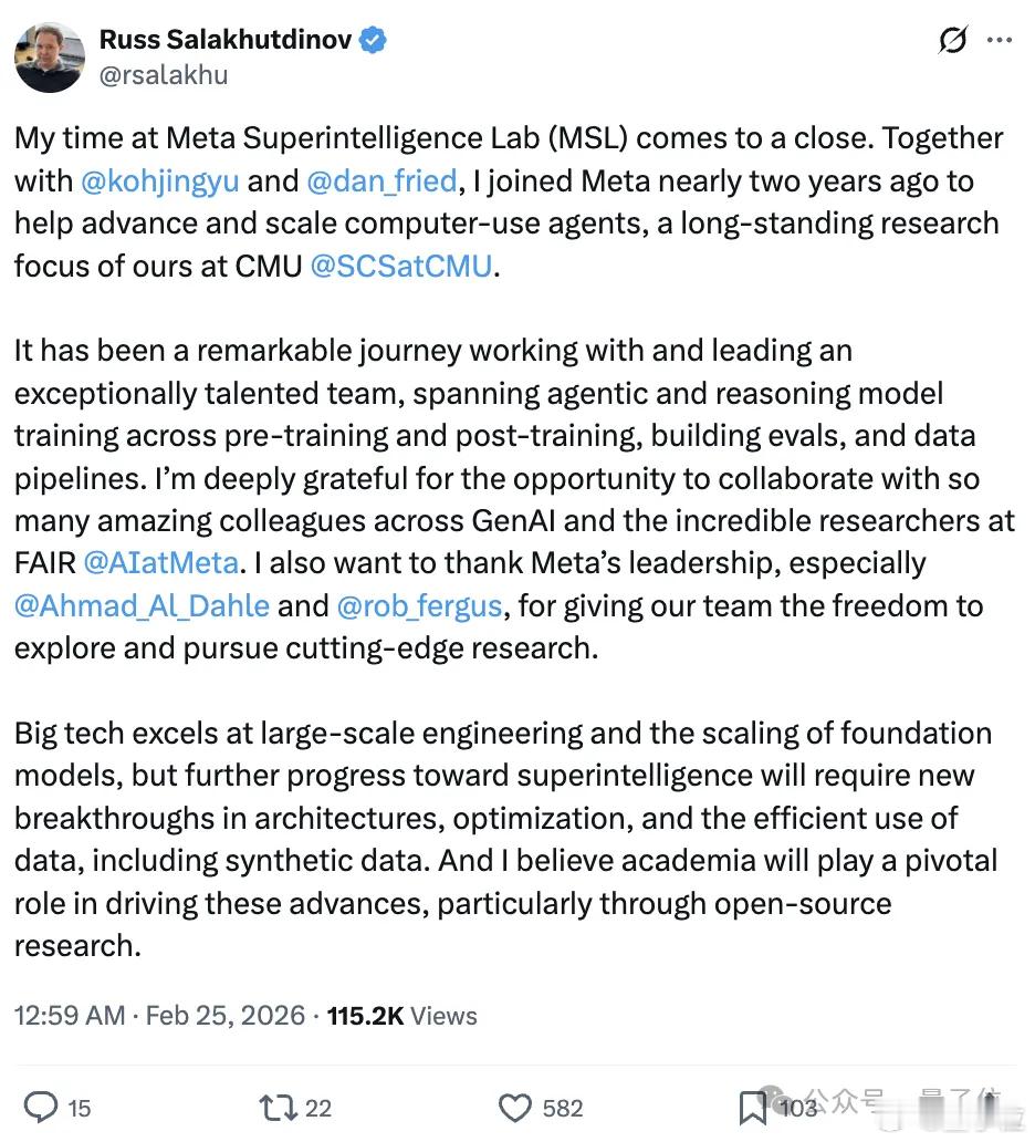 Geoffrey Hinton核心弟子、Meta生成式人工智能研究副总裁、卡内基梅隆大学计算机科学教授、苹果首任AI总监Russ Salakhutdinov,在Meta任职已满两年,就在昨天也官宣离职了。