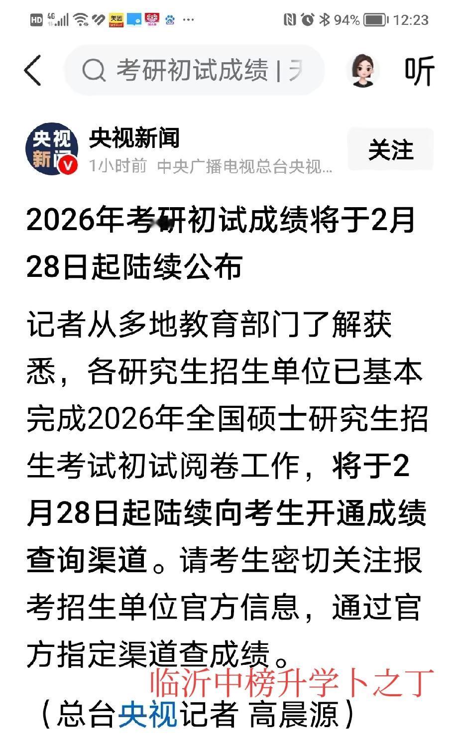26考研成绩发布时间实锤了!2月28日以后陆续发布!这样就行了,有个准确的时间,让考生们心里踏实一点,毕竟熬了那么久,拼了那么久,别再等待那么久。多少个日夜的辗转反侧,寝食难安,一天天的等,一天天的盼。现在好了,尘埃落定了,28号,一战成硕。欢迎大家留言文明交流!