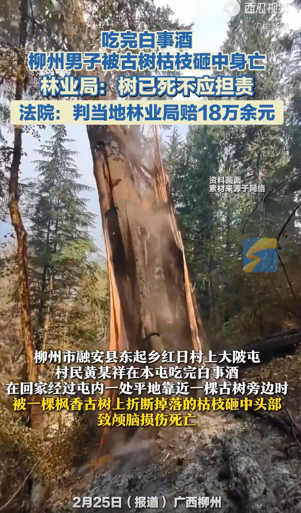 广西柳州,一个村民吃完白事酒往家走,经过村里那棵挂了牌的老古树时,一根枯枝突然砸