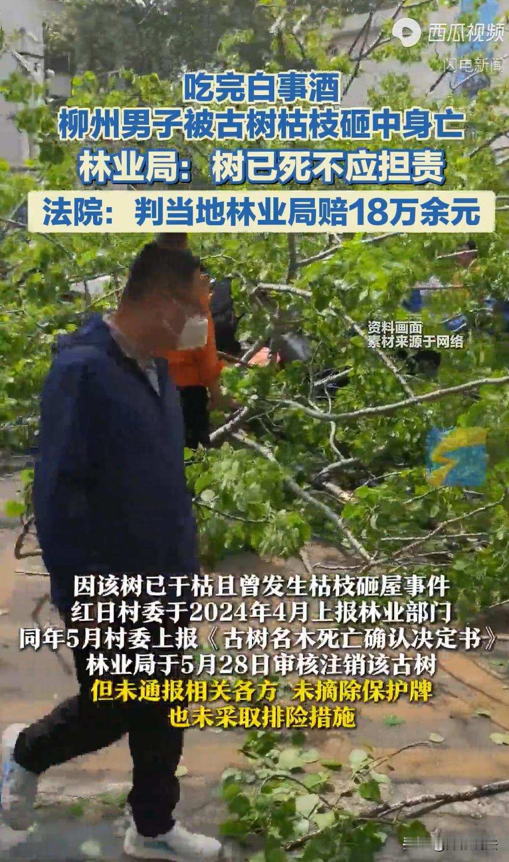 广西柳州,一个村民吃完白事酒往家走,经过村里那棵挂了牌的老古树时,一根枯枝突然砸下来,人当场没了。这棵树是林业局挂牌保护的,160岁了,早就枯死了。村里之前就报告过,说枯枝砸过房子,危险。林业局也确实办了手续,在系统里把树注销了,可那牌子还挂在树上,枯枝也没人砍。人死了,家属找上门。林业局说:系统里都没这树了,凭啥赔?家属不服,告上法院索赔。法院这样判决。   2024年6月21日傍晚,屯里的黄某祥刚刚吃完一场白事酒席,同村的熟人过世了,他帮着忙前忙后,礼数尽到了,饭也吃过了,便一个人沿着屯里的老路往回走。   这条路他走了几十年,闭着眼睛都知道哪儿有坎、哪儿有弯。经过屯里那块平地时,他习惯性地靠近路边走,旁边就是那棵老枫香树。   这树有些年头了,村里老人都说,打他们爷爷那辈起,这树就在那儿站着。树干粗得要两三个人才能合抱,枝丫伸得老开,夏天能遮出一大片阴凉。   只是这些年,树老了,枝叶渐渐枯了,没什么生气,但毕竟是个标志,大家路过也都习惯了。   谁也没料到,意外就那么发生了。   黄某祥刚走到树底下,头顶上咔嚓一声闷响,一根枯死的树枝突然断裂,直直砸了下来。   他来不及躲,也根本没想到要躲,那碗口粗的枯枝不偏不倚砸在他头上。   人当场就倒下去了,血流了一地。   屯里人听见响动跑过来,一看是黄某祥,赶紧七手八脚送医院。   但伤得太重,颅脑损伤,人没救回来,就这么没了。   好好一个人,吃完一顿酒席,回家路上就这么走了。家里人哪接受得了?媳妇钟某英、儿子黄某华,哭得稀里哗啦。   丧事办完之后,他们就想弄明白,这事儿到底该谁负责?   那棵树的身份不一般。它不是普通的野树,是一棵挂了牌的“古树”。   2018年的时候,林业局给它挂了块“广西壮族自治区古树名木保护牌”,树龄鉴定是160年,属于受保护的古树。   这棵树之前就出过事,掉下来的枯枝砸过村民的房子,好在没伤到人。   4月中旬,村委也觉得悬,专门逐级去报告,说这树危险,得处理一下,情况报给了县林业局。   县林业局接到报告后,按程序走了一道。   5月28日,县林业局审核同意了,在系统里把这棵古树给注销了。   可问题是,注销只是在系统里点个确认,那块“古树名木保护牌”还挂在树上,没摘。   村里没人接到通知说这树已经不是古树了,乡里也没人知道县里已经批了注销。   更关键的是,那棵树还立在那儿,枯枝还挂在树上,谁也没去动它。   就这么着,黄某祥路过,出事了。   出事之后,那棵树才被砍掉清理了,保护牌也终于摘了下来。   但人已经没了,说什么都晚了。   案子闹得法院,双方争得厉害。   黄某祥的家人认为,这树是林业局挂牌保护的,从头到尾都是林业局在管,出了事应该担责。   县林业局也有自己的说法,他们觉得,自己冤得很,树是死了,在系统里注销了,法律上这棵树已经不是古树了,不再是林业局的管理对象。既然不是管理者,凭什么还要担责?   法院会如何判决呢?   《民法典》第一千二百五十七条规定,因林木折断、倾倒或者果实坠落等造成他人损害,林木的所有人或者管理人不能证明自己没有过错的,应当承担侵权责任。   《广西壮族自治区古树名木保护条例》第三条规定,本条例所称古树,是指树龄在一百年以上的树木。   第六条规定,县级以上人民政府林业、城市绿化主管部门为本行政区域内古树名木保护主管部门。   法院指出,涉案树木树龄为160年左右,属于古树,县林业局属于主管单位,虽然县林业局已于2024年5月28日在系统内完成注销,但事发时,该古树上仍悬挂着该局加挂的《广西壮族自治区古树名木保护牌》。   法院认为,这块牌子具有公示公信效力,代表着主管部门对该树的管理,保护牌未被摘除,意味着县林业局作为管理人的外部法律状态并未改变,其法定管理职责并未因内部操作而实际转移或灭失。   法院进一步查明,早在事发前两个月的2024年4月,村委已向乡林业站报告该树枯枝掉落存在安全隐患,乡站也随即上报县局。   这意味着,县林业局明知危险,但仅于5月28日完成内部系统注销,既未将注销结果通知所有人、村委或乡政府,也未采取修剪、移除或设置警示等任何实质性的排险措施。   至于县林业局“系统注销即免责”的抗辩。   法院明确指出,内部系统操作仅属于内部工作流程,不能当然产生对外的法律效力。   古树名木的退出,必须经过严格的外部公示程序,让利害关系人知晓。   换言之,县林业局不能以内部流程的便利为由,忽视其负有的保障义务。   最后,法院认定县林业局的责任并未免除,且其过错程度较大,判决其对死者家属的损失承担70%的赔偿责任,总共182627.9元。   而剩下的30%应由村里承担,但村里那部分死者家属没起诉,法院也就不处理,只判了林业局该赔的那一份。   对此,您怎么看?@洋仔说法
