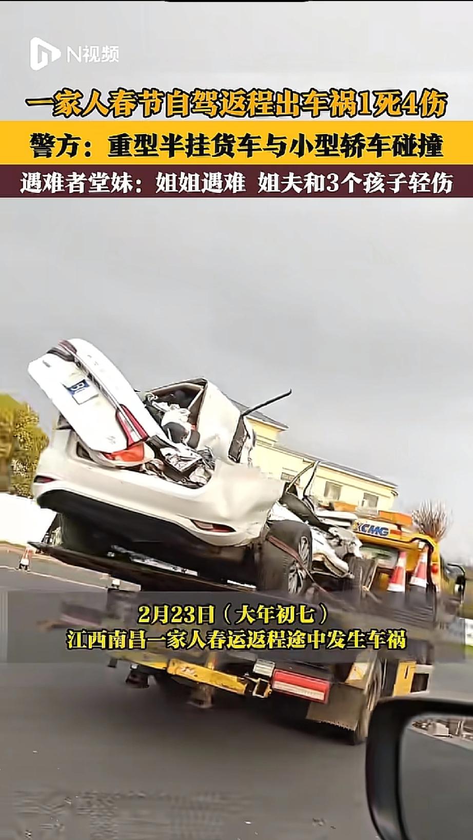刚过完年就阴阳两隔,返程路上的一场意外,直接毁了一个家,太让人心碎了。 大年初七,南昌一家五口从娘家开开心心返程,谁能想到在吉安高速上, 被大货车硬生生挤到护栏边,车身严重变形。姐姐当场遇难, 姐夫和三个孩子侥幸轻伤,却永远失去了最亲的人。 娘家妈得知消息哭晕好几次,二十多位亲人连夜赶往吉安, 再多的赔偿也换不回活生生的人,三个孩子再也没有妈妈疼了。 你规规矩矩开车,躲不过别人的疏忽大意。平安从来都不是小事, 是一家人最大的福气。高速行车一定要多加小心,远离大车,珍惜每一次团圆。