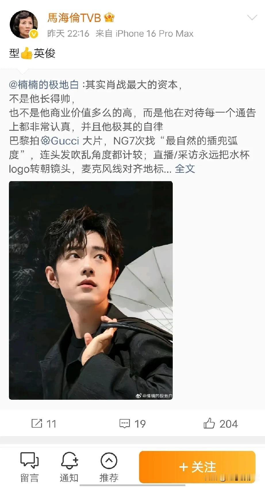 只需认真看他一部剧,或者一个舞台,或者一个访谈,你就会无可救药喜欢上她[心]香港TVB的老牌明星连追几天肖战的《藏海传》后,已经开始在肖战米兰出发图里开始点赞评论了[比心] 就像东方跨年舞台的女主持人,看过肖战舞台,近距离接触到肖战后,第二天发文称自己正式成为肖战粉丝,喜欢肖战不要听别人说,要自己去看他的表演,听他说话,听周围合作过见过他的人的评价。你就知道为什么那么多人喜欢肖战了,喜欢一个真正好的人,喜欢一个真正有实力的人,是很美好的事