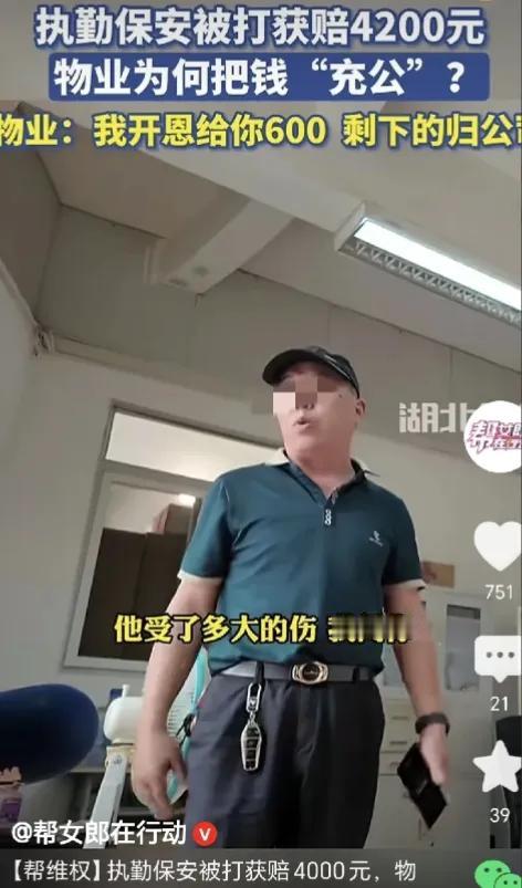想钱想疯了!湖北武汉,一男子在小区当保安,执勤时被业主打伤,业主赔偿他4200元,男子不会电子支付,委托物业帮他收款,事后,男子到物业要钱,物业经理不给: 这是业主赔给物业的钱,我开恩给你600元,剩余的钱充公!结局令人意外! 这名保安姓龚,今年五十多岁,在小区干了好几年。那天他像往常一样在岗亭值守,一名业主因为道闸问题情绪激动,上来就对他拳打脚踢,还把岗亭的玻璃砸了。 龚师傅被打得头晕目眩,身上多处淤青。他第一时间报了警,民警很快赶到现场。调看监控后,事情一目了然,错不在龚师傅。 在民警调解下,打人业主同意赔偿4200元。其中4000元是龚师傅的医疗费、误工费和精神损失,另外200元是岗亭玻璃的维修费。调解书上写得清清楚楚,每一笔钱的归属都有明确说明。 龚师傅年纪大,不会用智能手机,也没有电子支付账户。他想着物业是自己的单位,应该靠谱,就委托物业代收这笔赔偿款。 他万万没想到,自己的信任换来的是一场算计。 几天后,龚师傅去物业办公室要钱。接待他的是陈经理,对方的话像一盆冷水浇下来。 “这钱是业主赔给公司的,跟你没关系。”陈经理叼着烟,语气轻佻,“我开恩给你600块,剩下的就当充公了。” 龚师傅当场就懵了。他反复解释,说民警调解时说得明明白白,4000元是赔给他个人的。可陈经理根本不听,还反过来指责他不懂规矩,说公司替他代收了钱,就有处置权。 龚师傅又气又急,血压一下子就上来了。他一个月工资才三千多,这4000元是他挨了打、受了罪换来的血汗钱,怎么就成了公司的? 他找过社区,找过街道,都没人能给他一个明确的说法。走投无路之下,他拨通了媒体的求助电话。 记者赶到小区时,陈经理一开始躲着不见,耗了两个多小时才慢悠悠地出来。面对镜头,他依旧理直气壮,坚持说钱是赔给公司的,给600元已经是“仁至义尽”。 记者当场联系了当天办案的民警。民警在电话里明确表态,调解协议条款清晰,4000元是龚师傅的个人赔偿,物业只有代收权,没有处置权,截留个人赔偿款是完全错误的。 在铁证面前,陈经理的脸色终于变了。他再也硬不起来,当场承认了错误,把4200元现金一分不少地还给了龚师傅,还道了歉。 据了解,这名陈经理事后也被公司严肃处理,调离了管理岗位。可不少人觉得,这样的处理还是太轻了。 毕竟,他不是一时糊涂,而是明目张胆地把员工的血汗钱当成了自己的“外快”。 这件事看着解气,背后却透着一股寒意。 一个在岗位上尽职尽责的保安,被业主打伤,好不容易拿到赔偿,却要被自己的公司“明抢”。经理那句“我开恩给你600元”,听着像施舍,实则是对劳动者尊严的践踏。 物业本应是员工的后盾,却成了压榨员工的“黑手”。这种把员工的血汗钱当成公司“小金库”的做法,不仅寒了一线劳动者的心,也暴露了部分企业管理者的贪婪和无知。 他们以为自己是“土皇帝”,可以随意处置员工的财产,却忘了法律和道德的底线。 更让人深思的是,像龚师傅这样的底层劳动者,在面对不公时,往往是最无助的。他们不懂法律,没有资源,甚至连电子支付都不会,只能任人拿捏。 如果不是媒体介入,这笔钱恐怕就真的被“充公”了。 这也给所有打工人提了个醒:在任何时候,都要学会保护自己的合法权益。遇到不公,不要忍气吞声,要敢于发声,敢于求助。 同时也给所有企业管理者敲了警钟:员工不是可以随意压榨的资源,尊重和保障员工权益,才是企业长久发展的根基。 那些把员工当“韭菜”割的企业,最终只会被市场和社会抛弃。 各位读者你们怎么看?欢迎在评论区讨论。