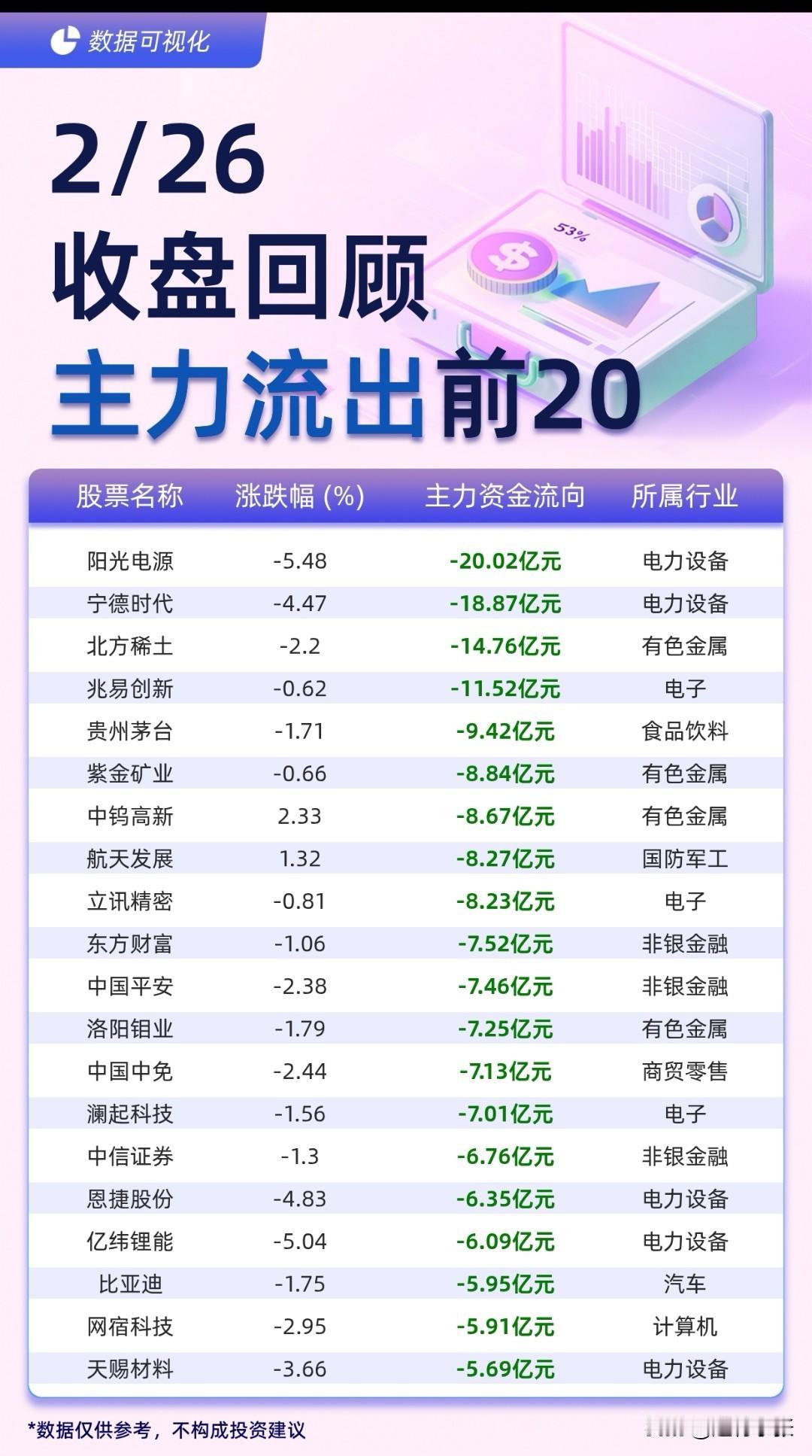 2月26日A股主力资金动向分化明显: 电子、通信板块成吸金主力,沪电股份、胜宏科技等个股获超10亿元资金追捧,多股强势涨停。 而电力设备、有色金属等板块遭遇资金撤离,阳光电源、宁德时代等龙头股流出超18亿元,市场风格切换信号清晰。 资金流向的剧烈分化,既反映了市场对科技成长赛道的追捧,也凸显了对高估值板块的谨慎态度,投资者需紧跟资金脉络,把握结构性机会。