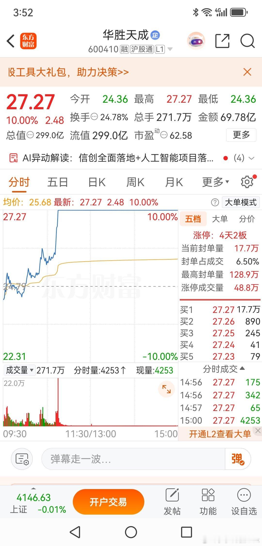 华胜天成,一旦成交过百亿,风险会再次降临华胜天成,2月24日的时候,有位群友问我是否要跑,我的回答是继续持有。让我们来一起回顾一下那天的走势,高开低走90亿的成交量33%的换手率。如果简单的看,在前期高点附近的这么一个高开低走的巨量阴线,是应该走的,但是问题从来不能简单看一根k线就能下结论的。持有的理由:1、华胜天成从25年8月份见顶以来,这半年基本上都是处于一个箱体震荡之中,24元的箱体顶部依然攻击了4次,这个在技术上符合四渡赤水的走势,这是一种突然的走势。2、大家还记的1月14、15两个涨停和16、19两个接近跌停的走势吗?那两天的大跌,是因为监管风暴导致的,属于主力准备大干一场但时机不对导致的。3、监管风暴导致的大跌,绝大部分股票都就此一江春水向东流了,华胜天成的主力花了一个月又把股价拉了回来,说明监管风暴导致的大跌,主力并没有跑掉,反而变成了再一次的低吸。前面是24日建议持有的理由,但是对于突破之后的走势,我们确是要小心一点。很多人认为突破前高就会吃大肉的想法,其实恰恰相反,很多新高之后都是坑爹的走势。今天的涨停量能还算了温和,未来大概率还是有一定的溢价,但是你必须清晰的知道,创新高以后不能再出现成交量的急剧放大。因为没有套牢筹码的放量,基本上都是以主力跑为主,所以华胜天成一旦单日成交达到100亿就要高度注意风险了。欢迎加入我们的免费交流群财经股票
