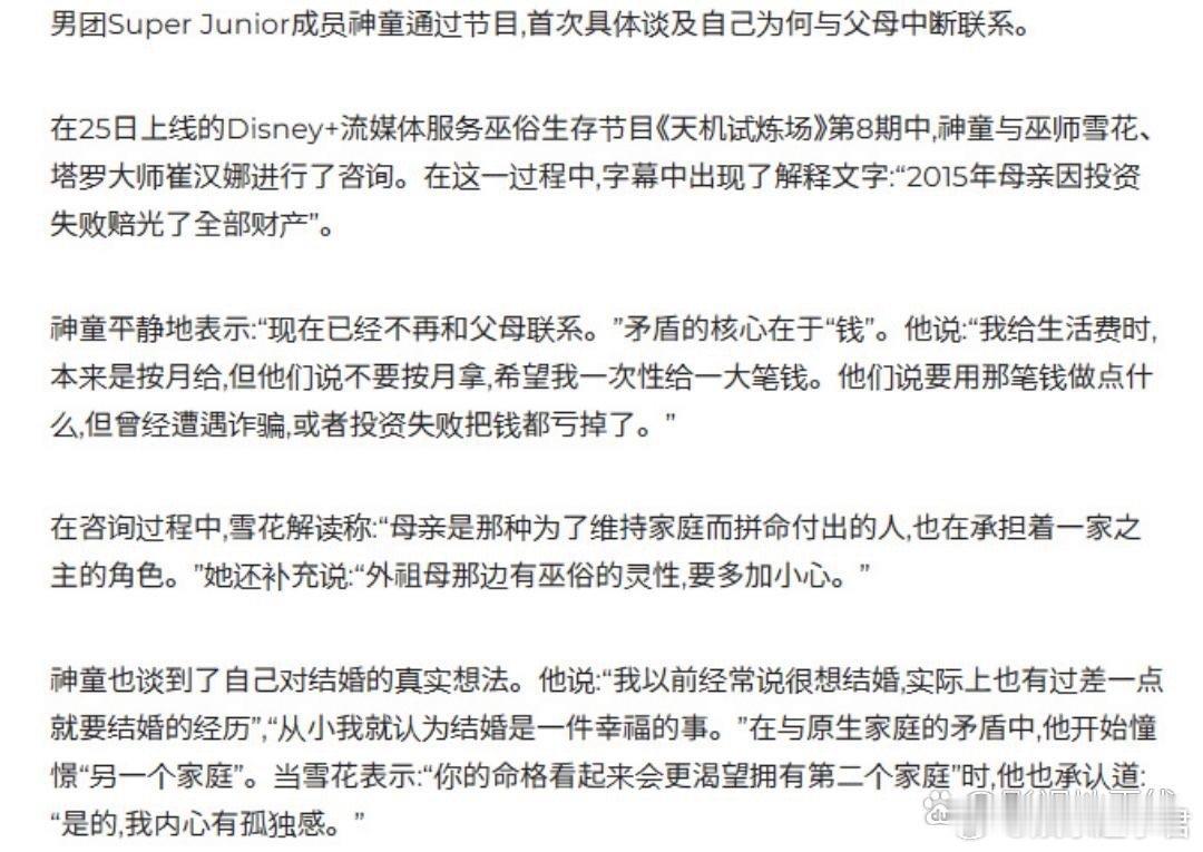 近日,男团Super Junior成员神童在节目中透露,自己已经与父母断绝了联系,矛盾的核心在于钱。“妈妈总是对我说,‘你别每个月给生活费了,一次性给我一大笔,我想做点什么,让你以后不用操心’,她一直想要一笔大钱。曾经她拿走了大笔资金却被诈骗,也因投资失误而全部化为乌有。